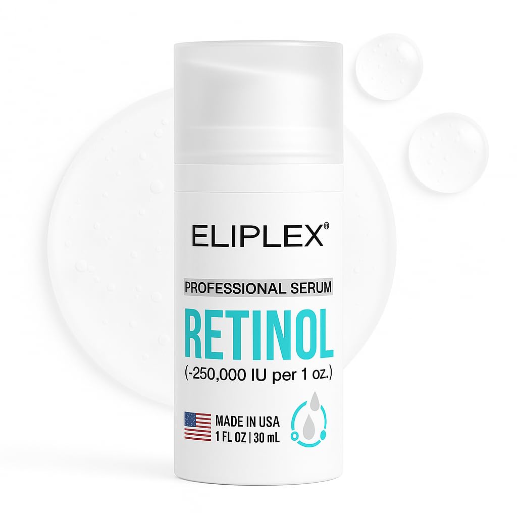 Smooth, refined, radiant-looking skin. ELIPLEX Retinol Professional Serum provides Vitamin A renewal to help visibly refine the look of texture and fine lines while brightening the overall appearance of the skin. The lightweight formula absorbs quickly, wears well under moisturizer, and fits easily into an evening routine. Airless pump. Made in USA. Size: 1 fl oz (30 mL). Directions (How to use) PM only, start slow: Apply a pea-size amount to clean, dry face 2–3 nights per week. Increase to every other night, then nightly, as skin tolerates. Follow with a gentle moisturizer. Daytime: use a broad-spectrum sunscreen. Avoid using in the same routine with strong exfoliating acids (AHA BHA). Patch test before first use.