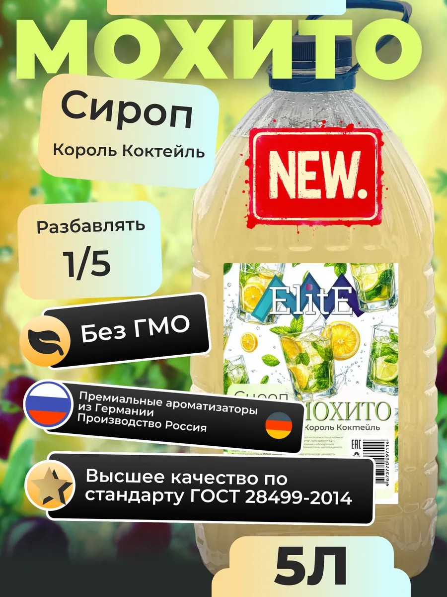 | Полное наименование товара | Сироп Мохито ElitE , 5л. (для лимонада, для коктейлей, для напитка) |