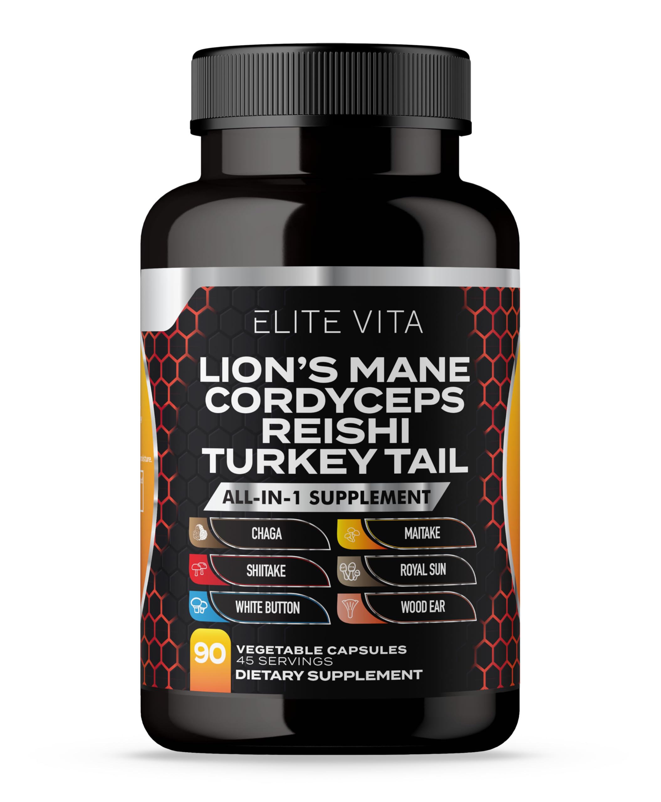 Unlock your brain's full potential with our premium Mushroom Nootropic Supplement. Crafted with a powerful blend of Lion's Mane, Cordyceps, Reishi, Chaga, Shiitake, Maitake, Turkey Tail, Royan Sun, White Button, and Wood Ear, this natural brain booster is designed to enhance focus, memory, and cognitive function. Harnessing the adaptogenic properties of these ten potent mushrooms, our supplement supports mental clarity and sharpness, helping you stay alert and productive throughout the day. Lion's Mane promotes nerve growth factor (NGF) production, aiding in neural regeneration and optimal brain function. Cordyceps boosts oxygen utilization, improving energy levels and mental stamina. Reishi offers calming effects, reducing stress and promoting relaxation, while Chaga provides antioxidant support, protecting brain cells from oxidative damage. Formulated with your well-being in mind, our vegan capsules contain no artificial ingredients or fillers, ensuring purity and potency with every serving. Elevate your cognitive performance naturally with our Mushroom Nootropic Supplement and experience the difference in mental clarity and sharpness. Invest in your brain health today for a brighter, more focused tomorrow.Trusted Quality: Manufactured in an FDA-registered facility under strict quality control standards, our Mushroom Nootropic Supplement is backed by our commitment to excellence and customer satisfaction. Vegan and Pure: Our capsules are crafted with 100 natural ingredients, free from GMOs, gluten, and artificial additives, ensuring quality and purity with every serving. Stress Relief and Relaxation: Reishi and Chaga mushrooms offer calming effects, reducing stress levels and promoting a sense of relaxation for improved mental well-being. Natural Brain Booster: Utilizing the adaptogenic properties of mushrooms, our nootropic supplement supports optimal brain and immune system function without the need for synthetic ingredients or stimulants. Enhanced Cognitive Function: Experience heightened focus, memory retention, and mental clarity with our potent blend of Lion's Mane, Cordyceps, Reishi, Turkey Tail, Chaga, Wood Ear, Maitake, Royal Sun, and Shiitake mushrooms.