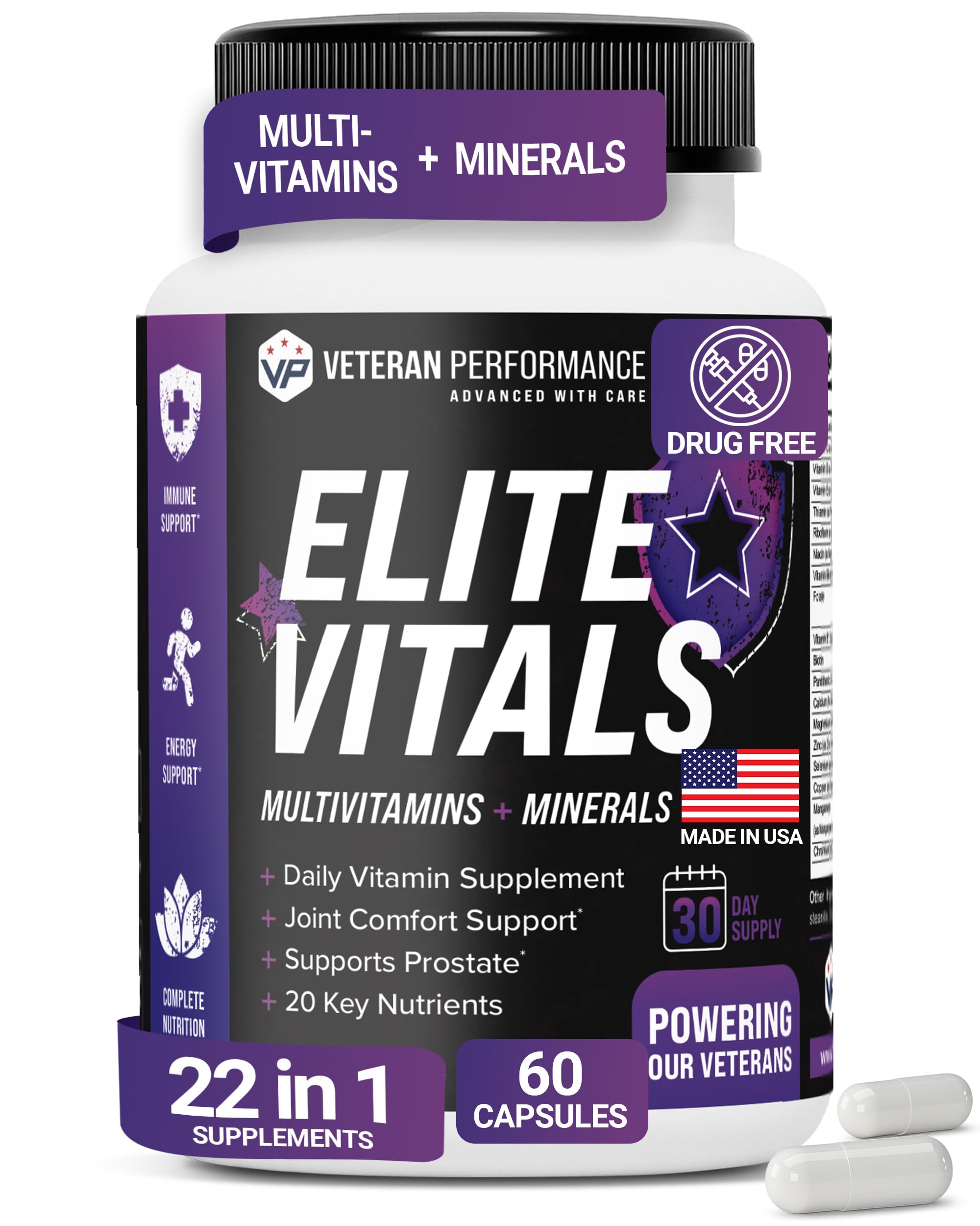 Elite Vitals Mens Daily Multivitamins with Vitamin B12 Gluten Free Immune Support Supplement for Prostate Joint & Energy with Zinc Green Tea +20 Essential Vitamins 60 Caps 60 Count (Pack of 1)