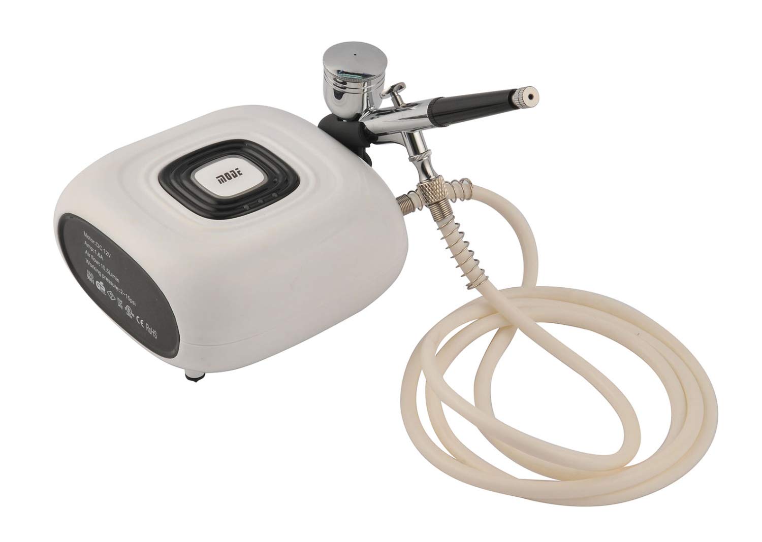 Scope of application: This product has a wide range of uses and can be used for skincare, personal grooming, nail art, hairstyling, makeup, scalp care, cake decorating, model making, art spray painting, etc. The makeup gun is a technique that uses an air pump and a special base to apply makeup. Liquid foundation is converted into a fine mist by a compressed spray gun and sprayed onto the skin's surface, resulting in a more even makeup application. Materials: Polyethylene stainless steel. Instructions for use: 1. Connect one end of the power adapter to the air compressor and plug the adapter into the outlet. 2. Press the white button in the middle to start the air compressor. Press and hold this button for one second to adjust the pressure the LED will change accordingly. Different pressure ranges are displayed. Press and hold this button for 3 seconds to turn off the device. 3. It can start under pressure and continue to operate. 4. Built-in thermal protection device when the machine overheats, this product automatically shuts down after the temperature cools, the machine restarts.
