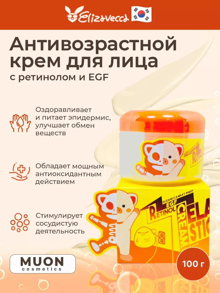 Elzavecca Milky Piggy EGF Retinol Cream – крем для лица содержащий ретинол, частицы золота и EGF.Обогащенный витаминами и минералами, ароматный крем превратит процесс ухода за собой в настоящее удовольствие.Ретинол уменьшает глубину морщин,борется с акне, осветляет пигментные пятна, повышает упругость кожи.Частицы золота увлажняют кожу, обладают противовоспалительными и питательными свойствами.Основной действующий компонент EGF – ускоряет процесс обновления клеток кожи. Он обладает защитным эффектом, останавливает процесс увядания кожи,благоприятно действует на цвет лица. Ретинол – производная витамина А, стимулирует сосудистую деятельность и наполняет кожу влагой, которая так необходима в борьбе со старением. С его помощью видимо разглаживаются морщины и сводится к минимуму появление новых. Крем предназначен для всех типов кожи. История бренда Elizavecca началась в 1986 году. Косметика делается в лучших традициях K-beauty и соответствует международным стандартам качества. Крема и маски производятся без вреда для окружающей среды. Отсутствие ГМО. В косметику не добавляют парабены, химикаты и прочие синтетические вещества, способные испортить кожу. Практичность. Все составы легко наносятся на кожу, смываются простой водой или совсем не требуют удаления.
