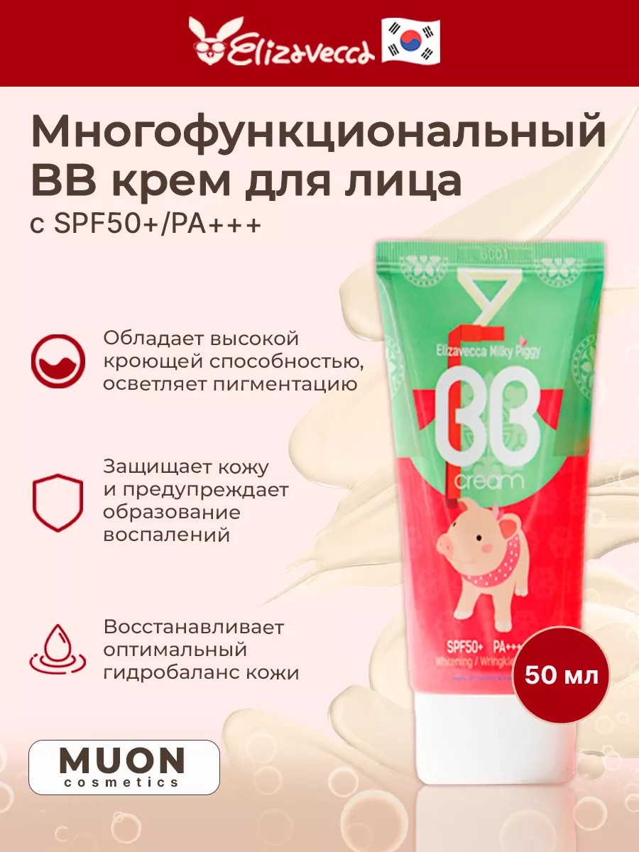 Elizavecca Milky Piggy BB Cream ББ-крем тональный фактором защиты SPF50+/PA+++ создает совершенное, но при этом естественное покрытие, маскируя несовершенства микрорельефа: покраснения, пигментные пятна, акне, черные точки. многофункциональный ББ крем помогает выровнять тон кожи и скрыть различные несовершенства, способствует осветлению пигментации и разглаживанию морщин, а также обеспечивает надежную защиту от УФ-излучения. Крем увлажняет и успокаивает кожу, предупреждает появление раздражений и шелушений.Имеет высокую кроющую способность, легко маскирует пигментацию, купероз, акне и др. несовершенства, при этом не создает эффекта маски. При регулярном применении крема происходит осветление пигментации, улучшается текстура кожи, повышается ее упругость, а морщины становятся менее выраженными. История бренда Elizavecca началась в 1986 году. Косметика делается в лучших традициях K-beauty и соответствует международным стандартам качества. Крема и маски производятся без вреда для окружающей среды. Отсутствие ГМО. В косметику не добавляют парабены, химикаты и прочие синтетические вещества, способные испортить кожу. Практичность. Все составы легко наносятся на кожу, смываются простой водой или совсем не требуют удаления.
