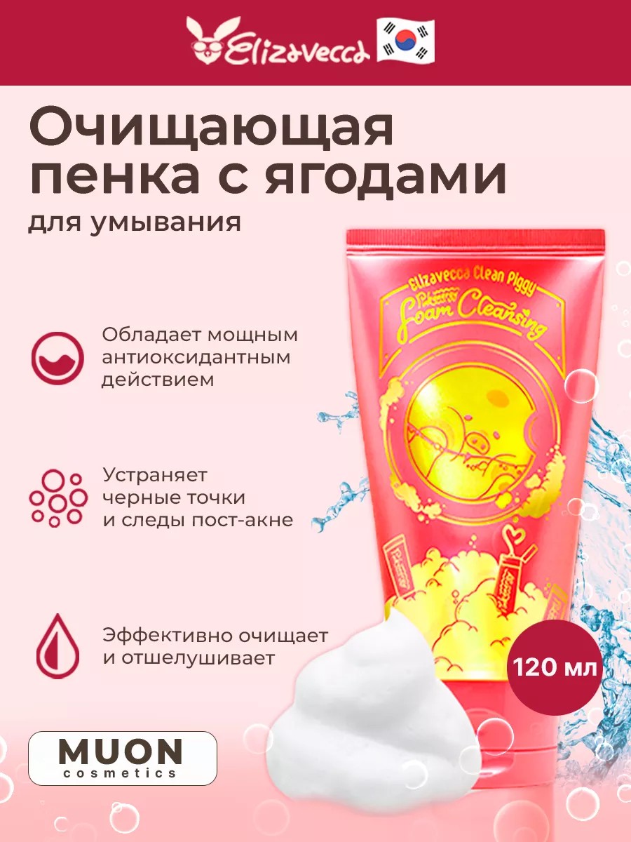 Elizavecca Clean Piggy Pinkenergy Foam Cleansing – ягодная пенка для умывания эффективно удаляет все виды загрязнений и остатки макияжа, глубоко очищает поры, способствует выведению токсинов. Насыщает кожу витаминами, выравнивает тон кожи и улучшает цвет лица. Комплекс экстрактов ягод (клубника, голубика, малина, клюква) насыщают кожу витаминами, способствуют регенерации клеток, отшелушивают ороговевшие клетки и наполняют кожу естественным сиянием. Средство стимулирует выработку коллагена, стимулирует и ускоряет регенерацию клеток, повышает скорость микроциркуляции крови.Экстракт розы и винограда являются мощнейшими природными антиоксидантами, которые отлично увлажняет кожу и улучшает процессы регенерации клеток, разглаживает мимические морщинки, нормализует выработку кожного сала и сужает поры, устраняет аллергические реакции на коже. Подходит для всех типов кожи и для ежедневного употребления. История бренда Elizavecca началась в 1986 году. Косметика делается в лучших традициях K-beauty и соответствует международным стандартам качества. Крема и маски производятся без вреда для окружающей среды. Отсутствие ГМО. В косметику не добавляют парабены, химикаты и прочие синтетические вещества, способные испортить кожу. Практичность. Все составы легко наносятся на кожу, смываются простой водой или совсем не требуют удаления. СПОСОБ ПРИМЕНЕНИЯ: Вспеньте немного средства и нанесите полученную пену на влажную кожу лица, помассируйте, а затем смойте водой.
