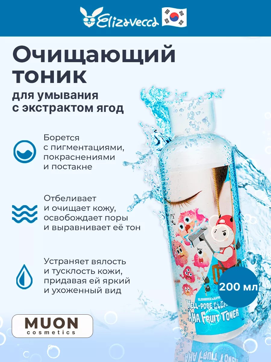 Creams and masks are produced without harm to the environment. GMO-free. Our cosmetics are free of parabens, chemicals, and other synthetic ingredients that can damage your skin. They're also practical. All ingredients are easy to apply and wash off with plain water, or don't require removal at all. HOW TO USE Elizavecca Hell Pore Clean Up Aha Fruit Toner: Apply to a cotton pad and wipe over your face after removing makeup. Initially, use 1-2 times a week, gradually increasing the frequency. Before use, be sure to test the toner on your wrist to determine how your skin reacts.