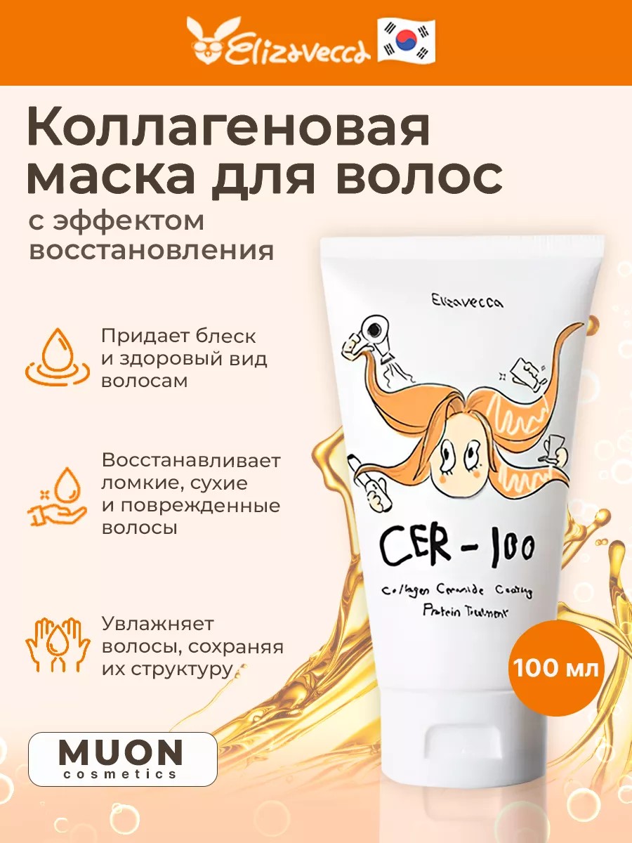 elizavecca cer-100 collagen ceramid coating protein treatment – коллагеновая маска для волос, интенсивно восстанавливает сухие, ломкие и поврежденные окрашиванием, термоукладкой или расчесыванием волосы. Активные компоненты проникают вглубь волос и укрепляют их изнутри, а снаружи образуют прозрачную защитную пленку, препятствующую агрессивному влиянию извне. Эффективность заключается в богатом составе, содержащим коллаген, керамиды, соевый и пшеничный протеин, аллантоин и целый комплекс растительных экстрактов. Гидролизованный коллаген – заполняет поврежденные участки структуры волоса, уплотняет его и разглаживает кератиновые чешуйки, восстанавливает кожу головы и волосяные луковицы. Гидролизованный кератин – уникальные свойства кератина позволяют ему проникнуть внутрь волоса и полностью заполнить поврежденные участки его структуры Комплекс керамидов – увлажняет, предотвращает потерю влаги, восстанавливает структуру, защищает от ломкости.Гидролат сельдерея – увлажняет, насыщает кожу витаминами и микроэлементами, усиливает барьерные функции, укрепляет волосяные луковицы, стимулирует рост волос. Экстракт овса способствует формированию структуры белков, разглаживает и выравнивает волос. Также в составе для волос содержатся растительные экстракты, которые усиливают оздоравливающее действие. История бренда Elizavecca началась в 1986 году. Косметика делается в лучших традициях K-beauty и соответствует международным стандартам качества.Крема и маски производятся без вреда для окружающей среды. Отсутствие ГМО. В косметику не добавляют парабены, химикаты и прочие синтетические вещества, способные испортить кожу. Практичность. Все составы легко наносятся на кожу, смываются простой водой или совсем не требуют удаления.