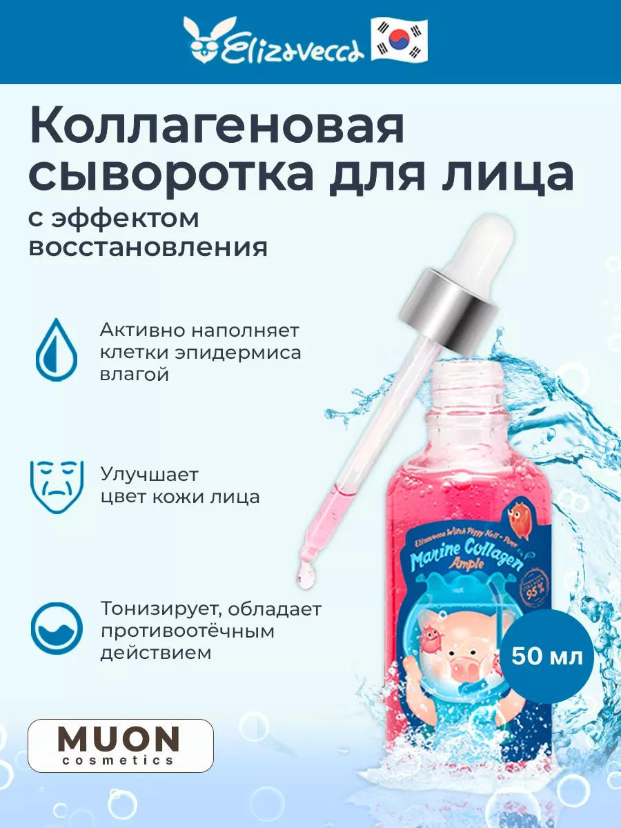 The Elizavecca brand's history began in 1986. Cosmetics are made in the best K-beauty traditions and meet international quality standards. Creams and masks are produced without harm to the environment. GMO-free. No parabens, chemicals, or other synthetic substances that can damage the skin are added to the cosmetics. Practicality. All formulations are easy to apply to the skin, rinse with plain water, or require no removal at all. HOW TO USE Hell-Pore Marine Collagen Ample: Apply the serum to clean skin of the face, neck, and décolleté, then massage it in. Suitable for daily use and can also be used under makeup.