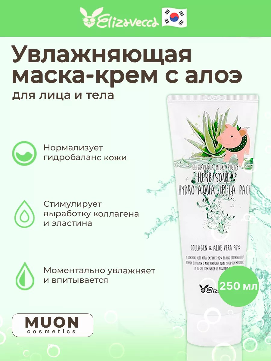 Elizavecca Milky Piggy Herb Soul Hydro Aqua Jella Pack - увлажняющая маска с алоэ вера и коллагеном, это универсальное средство которое можно использовать для кожи лица и тела, наносить после бритья и эпиляции, а также в качестве базы для макияжа или маски для кожи вокруг глаз. Маска не содержит парабенов, сульфатов, формальдегидов, искусственных красителей и масел животного происхождения. Маска содержит высокую концентрацию экстракта алоэ вера (92%) и гидролизованного коллагена, благодаря чему великолепно устраняет сухость и обезвоженность кожи, успокаивает раздражения и снимает покраснения. . В косметику не добавляют парабены, химикаты и прочие синтетические вещества, способные испортить кожу. Практичность. Все составы легко наносятся на кожу, смываются простой водой или совсем не требуют удаления.