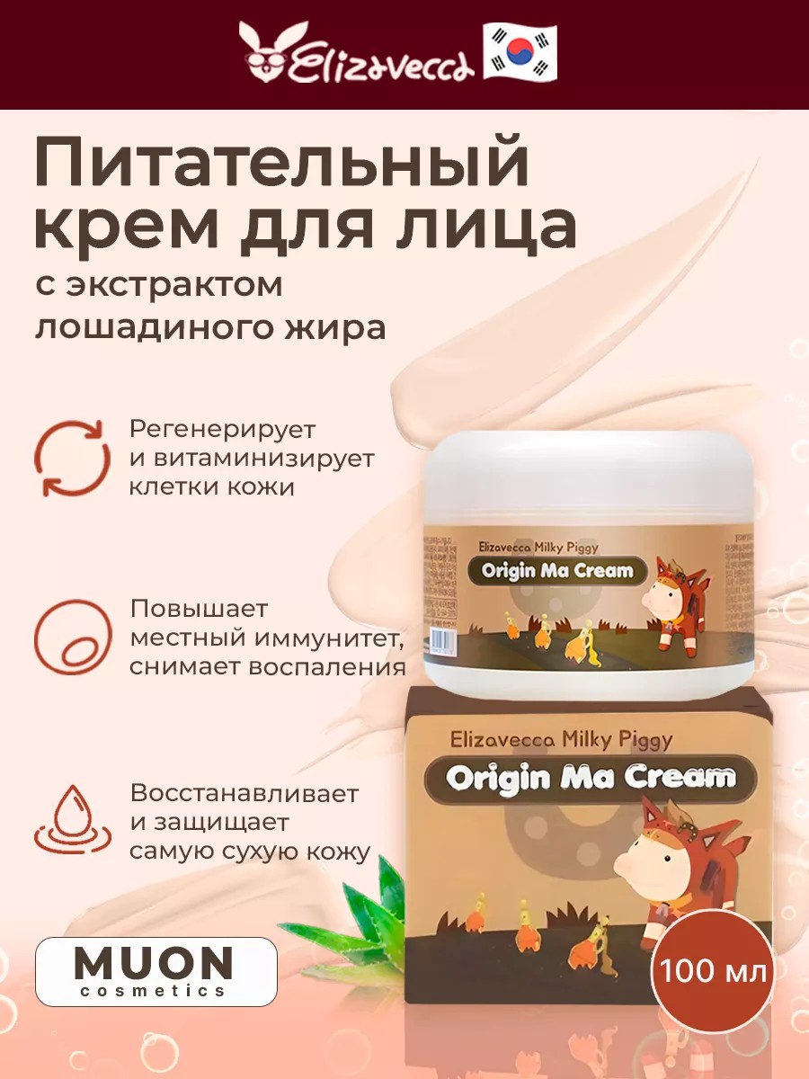 Elizavecca Milky Piggy Origin Ma Cream это питательный крем для лица с лошадиным жиром. Входящие в состав конский жир, кератин, гиалуроновая кислота, экстракт алоэ вера восстанавливают кожный покров, питают и увлажняют клетки. Ниацинамид обладает стимулирующими и отбеливающими свойствами. Крем подходит даже для гиперчувствительной кожи, эффективен для ухода за зрелой кожей. Имеет легкую тающую текстуру масла, которое тает от тепла кожи, мгновенно впитывается. История бренда Elizavecca началась в 1986 году. Косметика делается в лучших традициях K-beauty и соответствует международным стандартам качества. Крема и маски производятся без вреда для окружающей среды. Отсутствие ГМО. В косметику не добавляют парабены, химикаты и прочие синтетические вещества, способные испортить кожу. Практичность. Все составы легко наносятся на кожу, смываются простой водой или совсем не требуют удаления. СПОСОБ ПРИМЕНЕНИЯ: Elizavecca Milky Piggy Origin Ma Cream: После умывания и тоника, нанесите необходимое количество крема и мягко помассируйте.