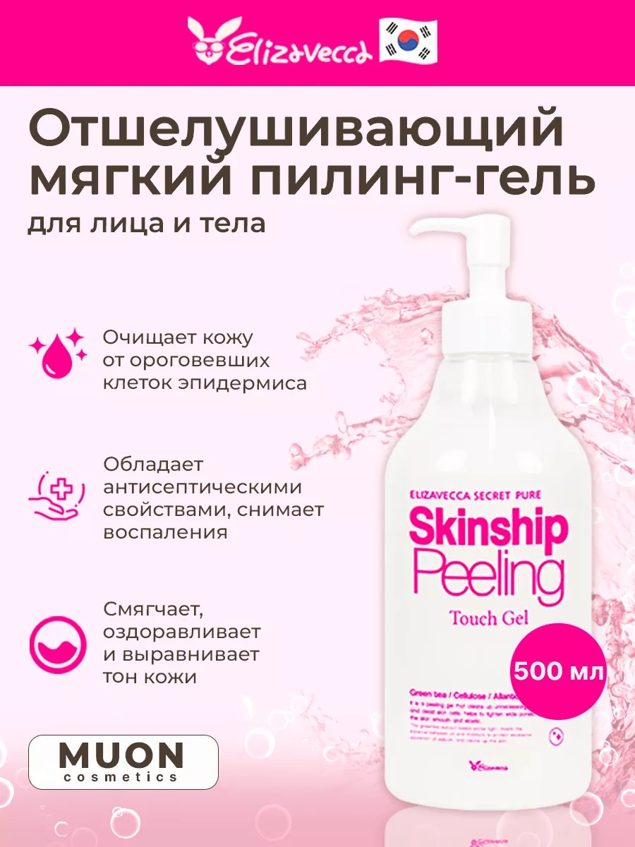Secret Pure Skinship Peeling Touch Gel (500 ml) from the professional Korean cosmetics brand Elizavecca evens out skin tone and improves its color. It perfectly cleanses the skin, removes dead and keratinized cells, prevents flaking, removes the stratum corneum, removing dead tissue and renewing the dermis. This product is gentle on the face without scratching or damaging it, neutralizes excess oiliness, and is suitable for sensitive skin as well as all skin types. Green tea, included in this product, strengthens blood vessels and facial skin cells, contains vitamins and various minerals, smoothes expression lines, improves skin tone, saturates with vitamins, nutrients, and microelements, effectively fights inflammation, regulates sebum production, and has an antioxidant effect. Hyaluronic acid regenerates and firms the skin of the body and face, making it more elastic and smooth. It actively absorbs water molecules, helping them to remain in the tissues. The history of the Elizavecca brand began in 1986. Cosmetics are made in the best traditions of K-beauty and meet international quality standards.