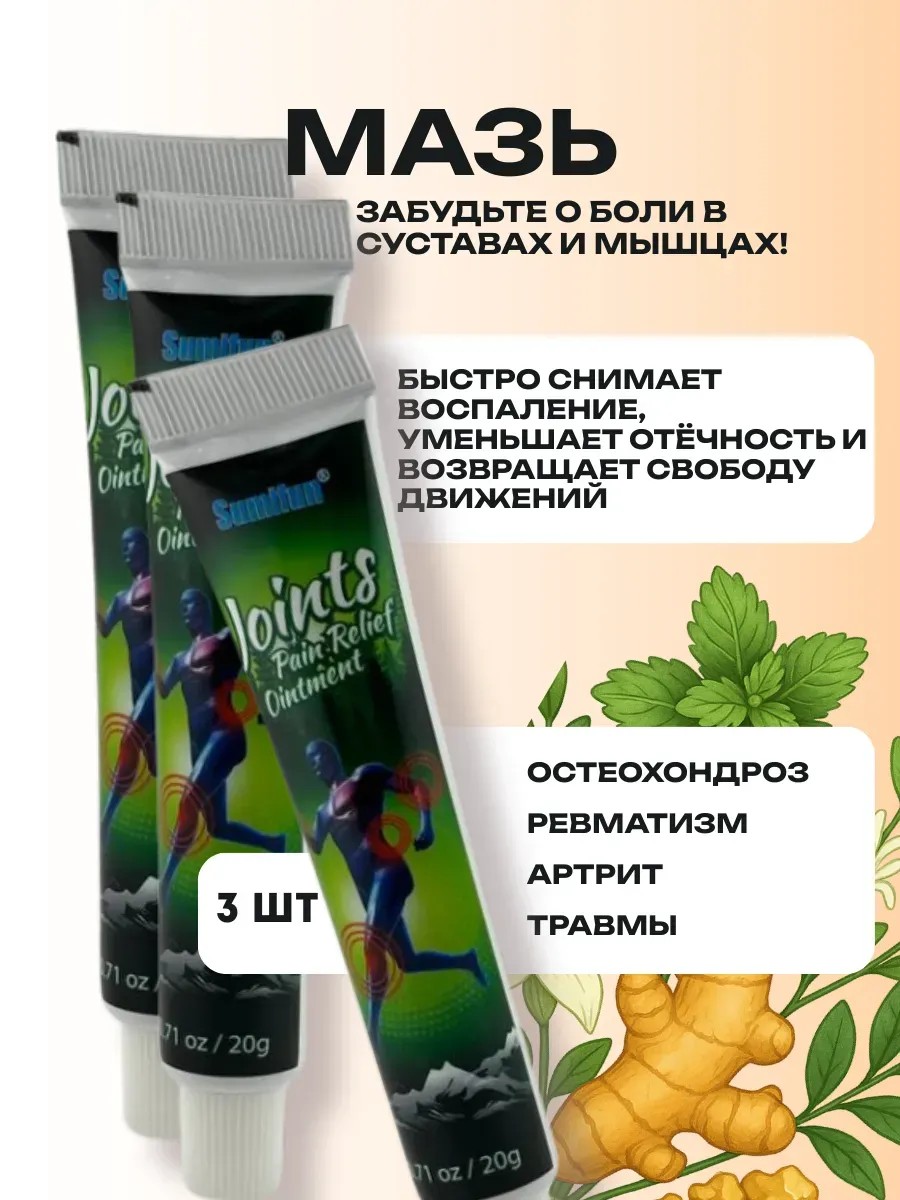 Мазь для суставов от боли — надёжный помощник для комплексного ухода за суставами и связками, а также для восстановления их гибкости и подвижности. Эта мазь для суставов изготовлена на основе экстрактов китайских трав, которые издавна применяются в традиционной медицине для снятия боли и воспалений. Для суставов особенно важно не только быстрое облегчение, но и глубокое воздействие на ткани, что способствует их полноценному восстановлению. Мазь для суставов от боли в коленях рекомендуется при артрите, артрозе, остеохондрозе, ревматизме, растяжениях, а также в период восстановления после травм. Крем для суставов помогает уменьшить скованность, снять отёчность, улучшить микроциркуляцию и вернуть лёгкость движений. Для суставов и связок средство подходит как мужчинам, так и женщинам, обеспечивая поддержку в период нагрузок и активной физической активности. В одном наборе вы получаете сразу три тюбика этого продукта, что удобно для длительного применения или семейного использования.