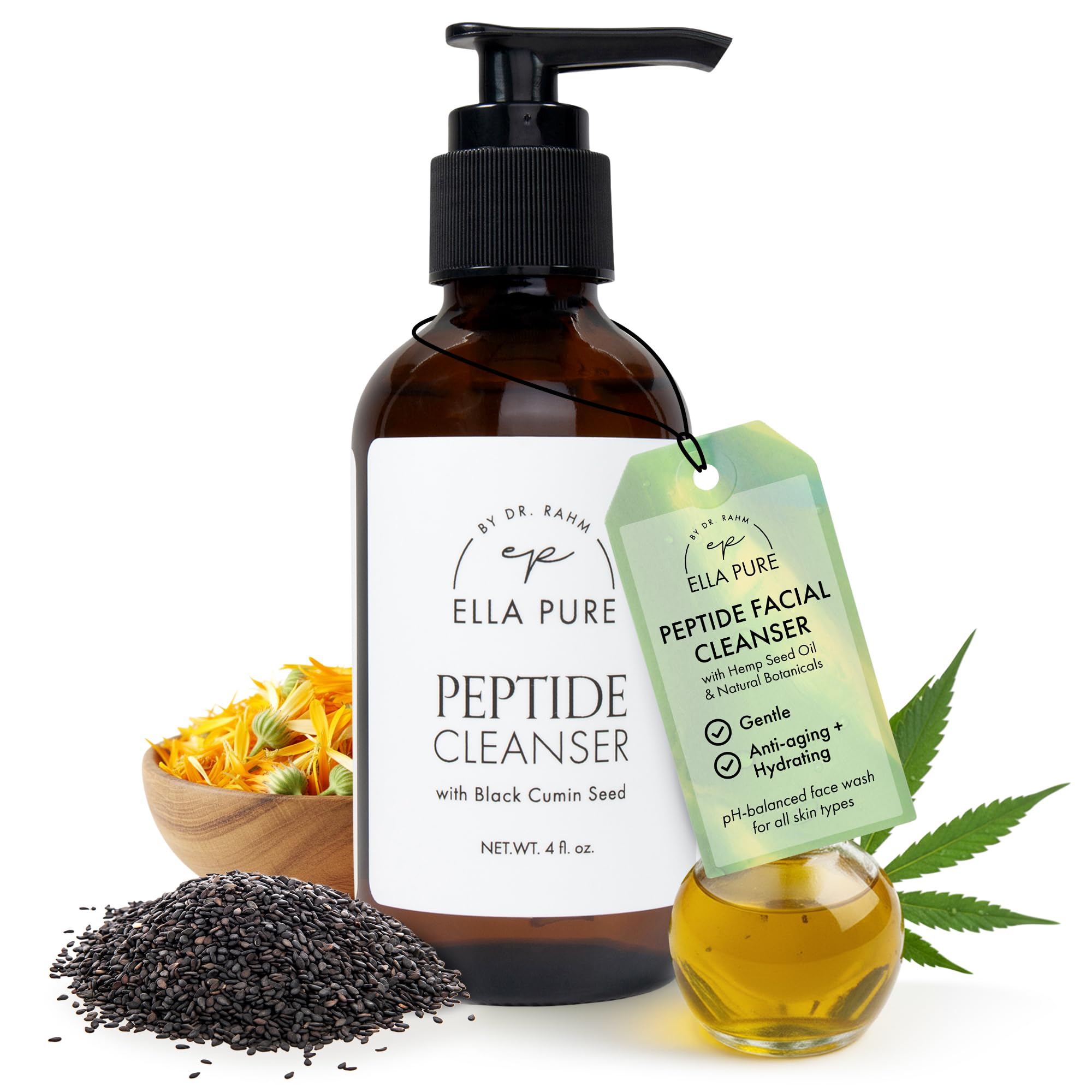 ELLA PURE Peptide Face Wash for Mature Skin Anti-Aging Facial Cleanser to Reduce Wrinkles & Improve Firmness Gentle & pH Balanced for Women Over 40 with Hemp Seed Oil 4oz