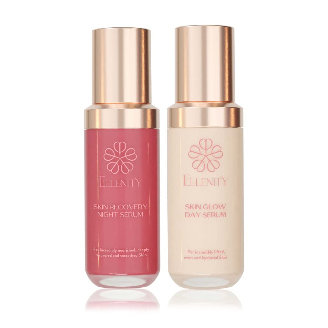 Ellenity's anti-aging hyaluron collagen booster set contains two highly effective serums that have been specially developed for day and night to specifically promote even, tight and hydrated skin. The Skin Glow Day Serum is a powerful hyaluronic day serum that contains the award-winning active ingredient DermCom to increase collagen and elastin production and promote visibly tighter and more elastic skin. The hyaluron complex in the formula hydrates and firms the skin for a smooth and youthful appearance. The addition of precious moonstone extract gives the skin a luxurious glow. The Skin Recovery Night Serum is an innovative night serum that contains highly effective ingredients that nourish, regenerate and rejuvenate the skin overnight to achieve an incredibly nourished, relaxed and smooth appearance. The clinically proven formula demonstrably reduces skin redness and increases skin elasticity to achieve a firmer and more youthful appearance. The hyaluron complex in the formula hydrates and firms the skin for a smooth and youthful appearance. Both serums are vegan and pH neutral, meaning they are suitable for different skin types, including dry, oily and combination skin. Production in Switzerland under the highest quality standards and the use of first-class ingredients underline the efficacy and reliability of the product. Use Ellenity's anti-aging hyaluron collagen booster set for complete skin care and experience healthy, radiant and hydrated skin, both day and night. Buy the set now and experience the benefits of these highly effective serums in combination with a great discount price. INGREDIENTS Skin Glow Day serum: Aqua, Glycerin, Polyglyceryl-3 Caprylate Succinate, Crocus Chrysanthus Bulb Extract, Propylene Glycol, Sodium Hyaluronate, Moonstone Extract, Trehalose, Cellulose Gum, Chondrus Crispus (Carrageenan) Extract, Ceratonia Siliquin Gum, Serum, Xanthan Gum, algin, urea, ethylhexylglycerin, sucrose, sodium benzoate, pullulan, acacia senegal gum, caprylyl glycol, citric acid, phenoxyethanol, pentylene glycol, perfume skin recovery night serum: aqua, glycerin, polyglyceryl-3 caprylate. Succine ate, rhododendron ferrugineum extract, propylene glycol, sodium hyaluronate, moonstone extract, urea, cellulose gum, chondrus crispus (carrageenan) extract, trehalose, serine, xanthan gum, algin, ethylhexylglycerin, sucrose, pullulan, ceratonia siliqua gum, sodium benzoate, caprylyl. glycol, citric acid, phenoxyethanol, pentylene glycol, perfume SAFETY WARNING no See moreInnovative active ingredients: The serums use innovative active ingredients such as the award-winning DermCom active ingredient to provide effective skin care based on the latest scientific knowledge. Effective anti-aging care: the serums contain award-winning active ingredients that intensively smooth, nourish and regenerate the skin to achieve incredibly even and nourished skin. High-quality ingredients: The use of high-quality ingredients and production in Switzerland under the highest quality standards ensure effective and reliable products. Luxury skin care: the serum contains a precious moonstone extract, which gives the skin a luxurious glow and creates a pleasant skin feeling. Contents: 1 x Ellenity's Skin Glow Day serum for tight skin, 30 ml 1 x Ellenity's Skin Recovery Night Serum for hydrated skin, 30 ml. bundle of collagen hyaluron booster day serum and hyaluron anti-aging night serum.'s Anti-aging Day Night Collageen Booster Set met sterk geconcentreerd hyaluron bekroonde actieve ingrediënten voor een strakke, gehydrateerde en stralende huid. Swiss Made Vegan 2 x 30ml De anti-aging hyaluron collageen boosterset van Ellenity bevat twee zeer effectieve serums die speciaal zijn ontwikkeld voor dag en nacht om een gelijkmatige, strakke en gehydrateerde huid gericht te bevorderen. Het Skin Glow Day Serum is een krachtig hyalurondagserum dat de bekroonde actieve werkzame stof DermCom bevat om de collageen- en elastineproductie te verhogen en zichtbaar strakkere en elastischere huid te bevorderen. Het hyaluroncomplex in de formule hydrateert en verstevigt de huid voor een gladde en jeugdige uitstraling. De toevoeging van edel maansteen-extract geeft de huid een luxe glans. Het Skin Recovery Night Serum is een innovatief nachtserum dat zeer effectieve ingrediënten bevat die de huid 's nachts voeden, regenereren en verjongen om een ongelooflijk gevoed, ontspannen en glad uiterlijk te bereiken. De klinisch bewezen formule vermindert aantoonbaar roodheid van de huid en verhoogt de huidelasticiteit om een strakkere en jeugdiger uiterlijk te bereiken. Het hyaluroncomplex in de formule hydrateert en verstevigt de huid voor een gladde en jeugdige uitstraling. Beide serums zijn veganistisch en pH-neutraal, wat betekent dat ze geschikt zijn voor verschillende huidtypes, waaronder droge, vettige huid en gemengde huid. De productie in Zwitserland onder de hoogste kwaliteitsnormen en het gebruik van eersteklas ingrediënten onderstrepen de werkzaamheid en betrouwbaarheid van het product. Gebruik de anti-aging hyaluron collageen boosterset van Ellenity voor een volledige huidverzorging en ervaar een gezonde, stralende en gehydrateerde huid, zowel overdag als 's nachts. Koop nu de set en ervaar de voordelen van deze zeer effectieve serums in combinatie met een geweldige voordeelprijs. INGREDIËNTEN Skin Glow Day serum: Aqua, Glycerine, Polyglyceryl-3 Caprylate Succinate, Crocus Chrysanthus Bulb Extract, Propyleen Glycol, NatriumHyaluronaat, Moonstone Extract, Trehalose, Cellulose Gum, Chondrus Crispus (Carrageenaan) Extract, Ceratonia Siliquin Gum, Serum, Xanthhan Gum, algin, ureum, ethylhexylglycerine, sucrose, natriumbenzoaat, pullulan, acacia senegal gum, caprylyl glycol, citrisch zuur, fenoxyethanol, pentyleenglycol, parfum skin recovery night serum: aqua, glycerine, polyglyceryl-3 caprylat. Succine ate, rhododendron ferrugineum extract, propyleenglycol, natriumhyaluronaat, maansteenextract, ureum, cellulose gum, chondrus 