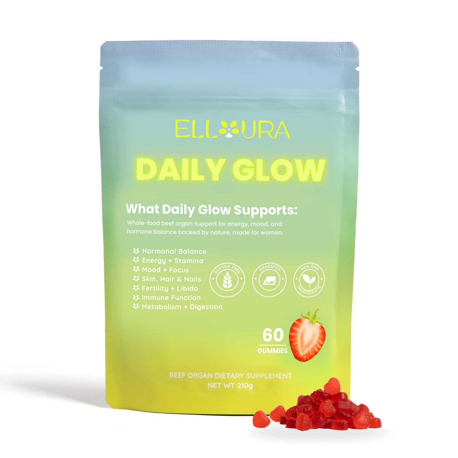 Grass-fed beef organ gummy supplement in Elloura Daily Glow pouch.