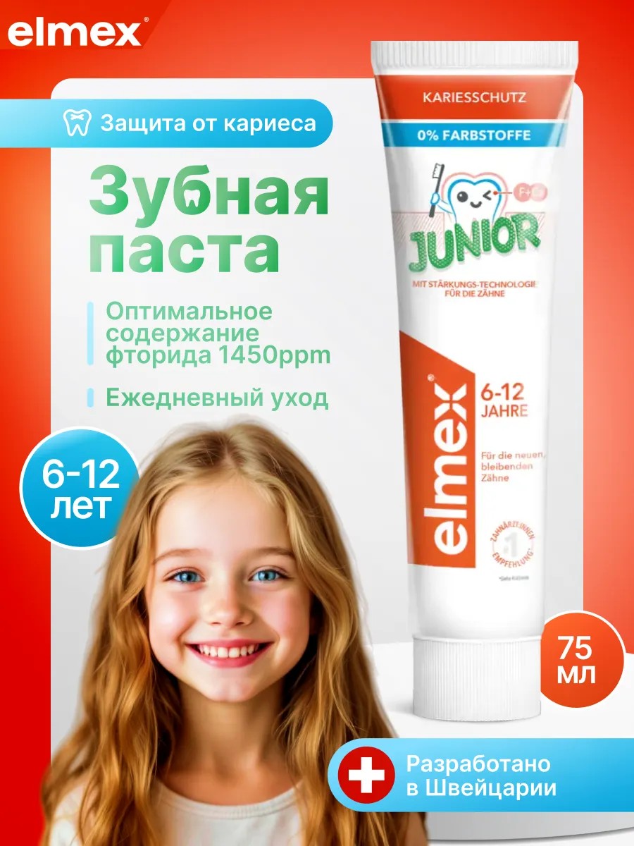 Children's toothpaste Junior against caries (6-12 years), 75 ml. Elmex Junior children's toothpaste (6-12 years) provides reliable protection against caries. Created specifically for children and teenagers aged 6, 7, 8, 9, 10, 11, and 12 years.