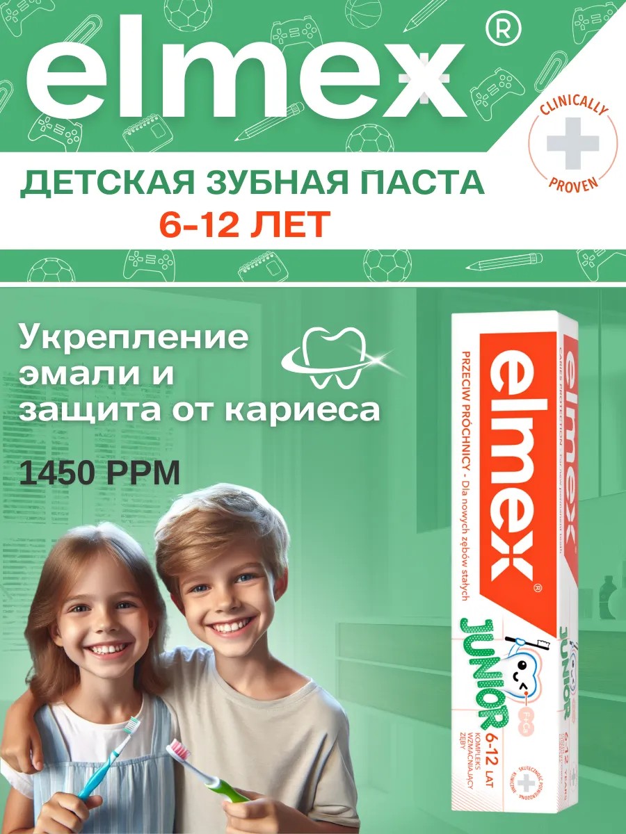 Профессиональная детская зубная паста Elmex Junior от 6 лет до 12 лет помогает укреплять эмаль и обеспечивает защиту от кариеса вновь прорезавшихся постоянных зубов вашего ребенка.