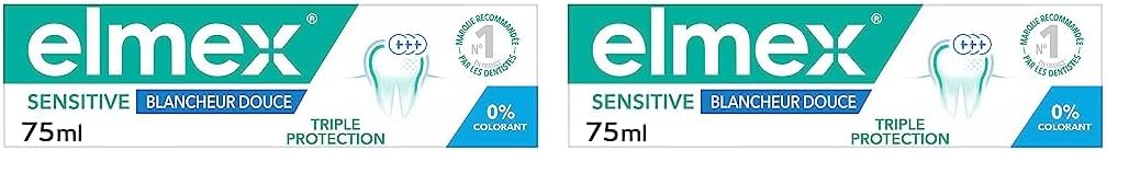 DES DENTS SAINES AVEC ELMEX : Marque N 1 recommandée par les dentistes, Elmex propose à ses consommateurs des produits d'hygiène bucco-dentaire performants aux bienfaits scientifiquement prouvés. MODE D'EMPLOI : Procédez à un brossage régulier, deux fois par jour, de préférence après les repas, pendant deux minutes. Pour plus d'efficacité, ce dentifrice peut être associé à la solution dentaire Elmex Sensitive Original. UNE FORMULE EFFICACE : Ce dentifrice Elmex Sensitive possède une formule qui nettoie les dents en douceur et contient du fluorure d'amines Olafluor qui renforce l'émail dentaire pour une prévention efficace des caries. MULTIACTION : Ce dentifrice blancheur apaise les dents sensibles durant 24h , lutte contre les caries et contribue à éliminer le tartre dentaire et les taches sur la surface des dents afin de rétablir leur blancheur naturelle. DENTIFRICE BLANCHEUR : Elmex dentifrice Sensitive Blancheur Douce possède une formule sans colorants, spécialement conçue pour garder les dents blanches, soulager la sensibilité dentaire et protéger les dents contre les caries. Les informations ci-dessous s'appliquent à chaque unité du pack.