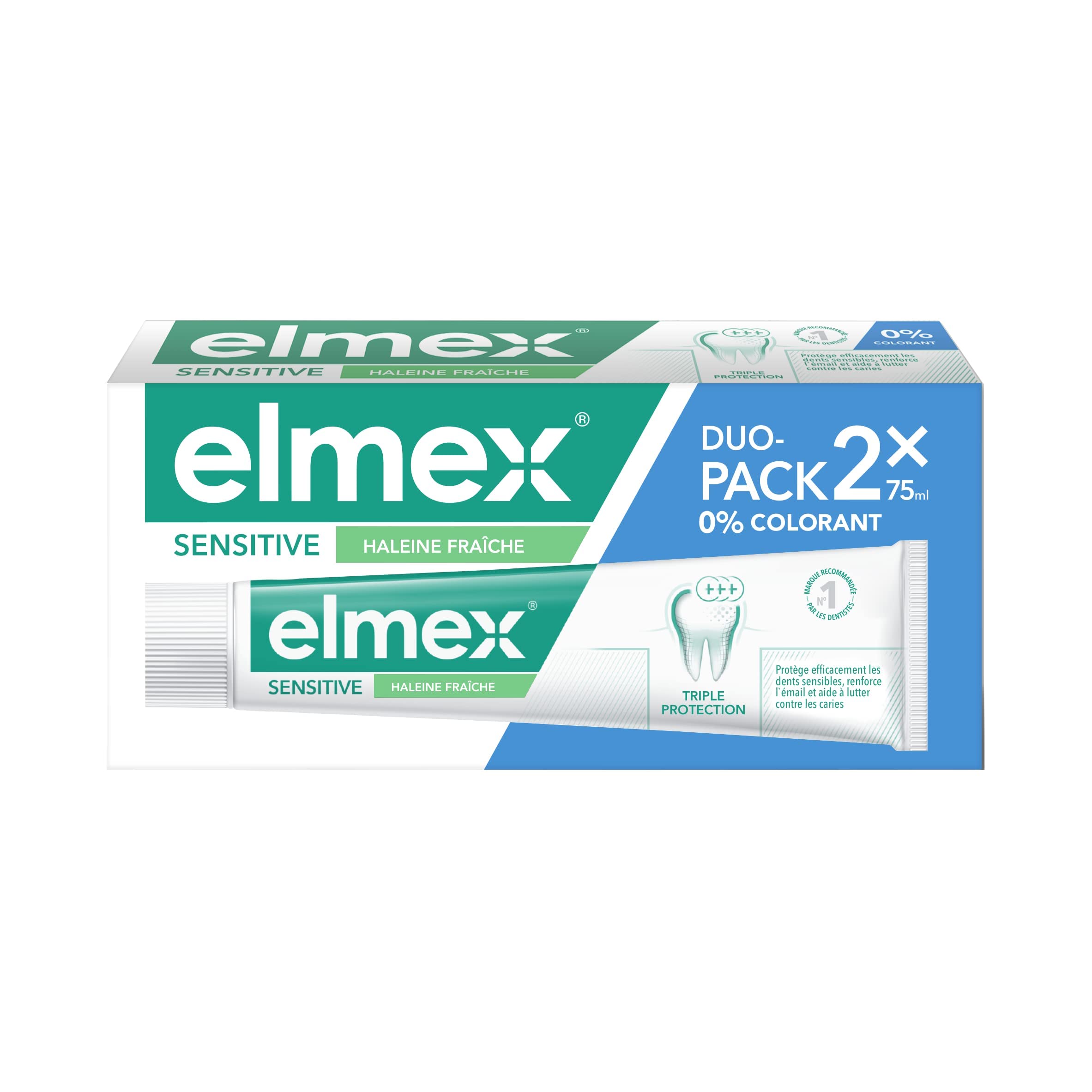 For 60 years, Elmex has offered effective oral hygiene products to use alone or as part of a complete routine. The scientifically proven benefits provide effective protection against cavities or tooth sensitivity in order to preserve the good health of your teeth. Developed in collaboration with scientists specializing in oral hygiene, the Elmex brand is the No. 1 brand most recommended by dentists . Our products are available in different ranges intended for children, protection against cavities, and care of sensitive teeth. Oral hygiene brand most often recommended by dentists in France. Quantitative study IQVIA 2022 Elmex Sensitive toothpaste protects against cavities, enamel loss and dental plaque. Its formula containing amine fluoride strengthens teeth and provides 24-hour protection against tooth sensitivity while leaving breath fresh. DIRECTIONS FOR USE Brush your teeth regularly, twice a day, preferably after meals, for two minutes. For greater effectiveness, this toothpaste can be combined with Elmex Sensitive Original dental solution. SAFETY WARNING Do not swallow, keep out of reach of children and avoid contact with eyes. HEALTHY TEETH WITH ELMEX: The No. 1 brand recommended by dentists, Elmex offers its consumers high-performance oral hygiene products with scientifically proven benefits. DIRECTIONS FOR USE: Brush regularly, twice a day, preferably after meals, for two minutes. For greater effectiveness, this toothpaste can be combined with the Elmex Sensitive Original dental solution. AN EFFECTIVE FORMULA: This Elmex Sensitive toothpaste has a formula that gently cleans teeth and contains Olafluor amine fluoride, which strengthens tooth enamel for effective cavity prevention. MULTIACTION: This toothpaste soothes sensitive teeth for 24 hours , fights cavities, helps remove dental tartar, and leaves a pleasantly fresh sensation in the mouth. All without added colorants. ELMEX FRESH BREATH TOOTHPASTE FOR SENSITIVE TEETH: This toothpaste has a dye-free formula, specially designed to relieve tooth sensitivity and protect teeth against cavities while leaving your mouth fresh. Depuis 60 ans, Elmex propose des produits d'hygiène bucco-dentaire performants à utiliser seuls ou en routine complète. Les bienfaits scientifiquement prouvés permettent d'assurer une protection efficace contre les caries ou la sensibilité dentaire afin de préserver la bonne santé de votre dentition. Mis au point en collaboration avec des scientifiques spécialistes en hygiène bucco-dentaire, la marque Elmex est la marque N 1 la plus recommandée par les dentistes . Nos produits se déclinent en différentes gammes destinées aux enfants, à la protection contre les caries, au soin des dents sensibles. Marque d'hygiène bucco-dentaire recommandée le plus souvent par les dentistes en France. Etude quantitative IQVIA 2022 Le dentifrice Elmex Sensitive protège contre la carie, la perte d'émail et la plaque dentaire. Sa formule contenant du fluorure d'amines renforce les dents et assure une protection de 24 heures contre la sensibilité dentaire tout en laissant une haleine fraîche. MODE D'EMPLOI Brossez-vous les dents régulièrement, deux fois par jour, de préférence après les repas, pendant deux minutes. Pour plus d'efficacité, ce dentifrice peut être associé à la solution dentaire Elmex Sensitive Original. AVERTISSEMENT DE SÛRETÉ Ne pas avaler, tenir hors de portée des enfants et éviter tout contact avec les yeux. DES DENTS SAINES AVEC ELMEX : Marque N 1 recommandée par les dentistes, Elmex propose à ses consommateurs des produits d'hygiène bucco-dentaire performants aux bienfaits scientifiquement prouvés. MODE D'EMPLOI : Procédez à un brossage régulier, deux fois par jour, de préférence après les repas, pendant deux minutes. Pour plus d'efficacité, ce dentifrice peut être associé à la solution dentaire Elmex Sensitive Original. UNE FORMULE EFFICACE : Ce dentifrice Elmex Sensitive possède une formule qui nettoie les dents en douceur et contient du fluorure d'amines Olafluor qui renforce l'émail dentaire pour une prévention efficace des caries. MULTIACTION : Ce dentifrice apaise les dents sensibles durant 24h , lutte contre les caries, contribue à éliminer le tartre dentaire et laisse une agréable sensation de fraîcheur en bouche. Le tout sans ajout de colorants. ELMEX DENTIFRICE HALEINE FRAÎCHE POUR DENTS SENSIBLES : Ce dentifrice possède une formule sans colorants, spécialement conçue pour soulager la sensibilité dentaire et protéger les dents contre les caries tout en laissant votre bouche fraîche.
