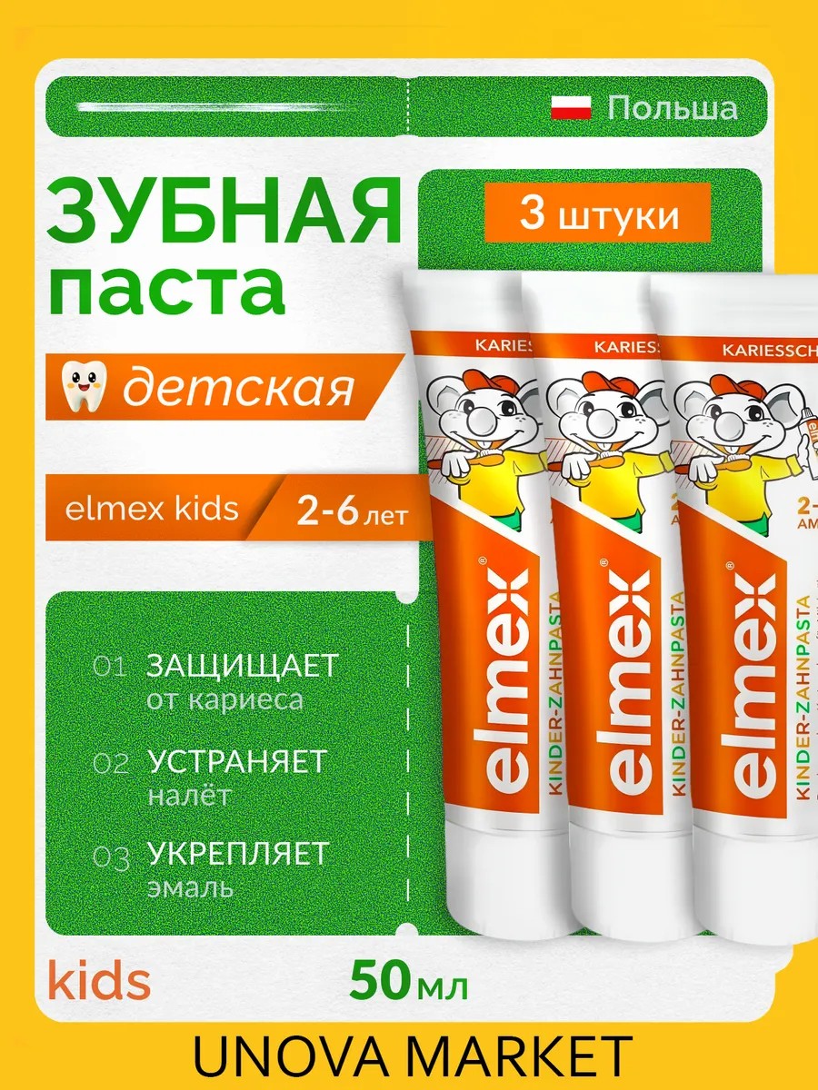 Детская зубная паста Elmex Kinder, с фтором 50 мл, 3 штуки. Подходит для детей от 2 до 6 лет. Специально разработана для ежедневного ухода и мягкой защиты, ещё не полностью сформировавшихся молочных зубов. Обладает приятным, но не сладким вкусом, который не провоцирует к проглатыванию. А персонаж мышь на упаковке сделают чистку весёлой игрой. Подойдёт как для девочек, так и для мальчиков.