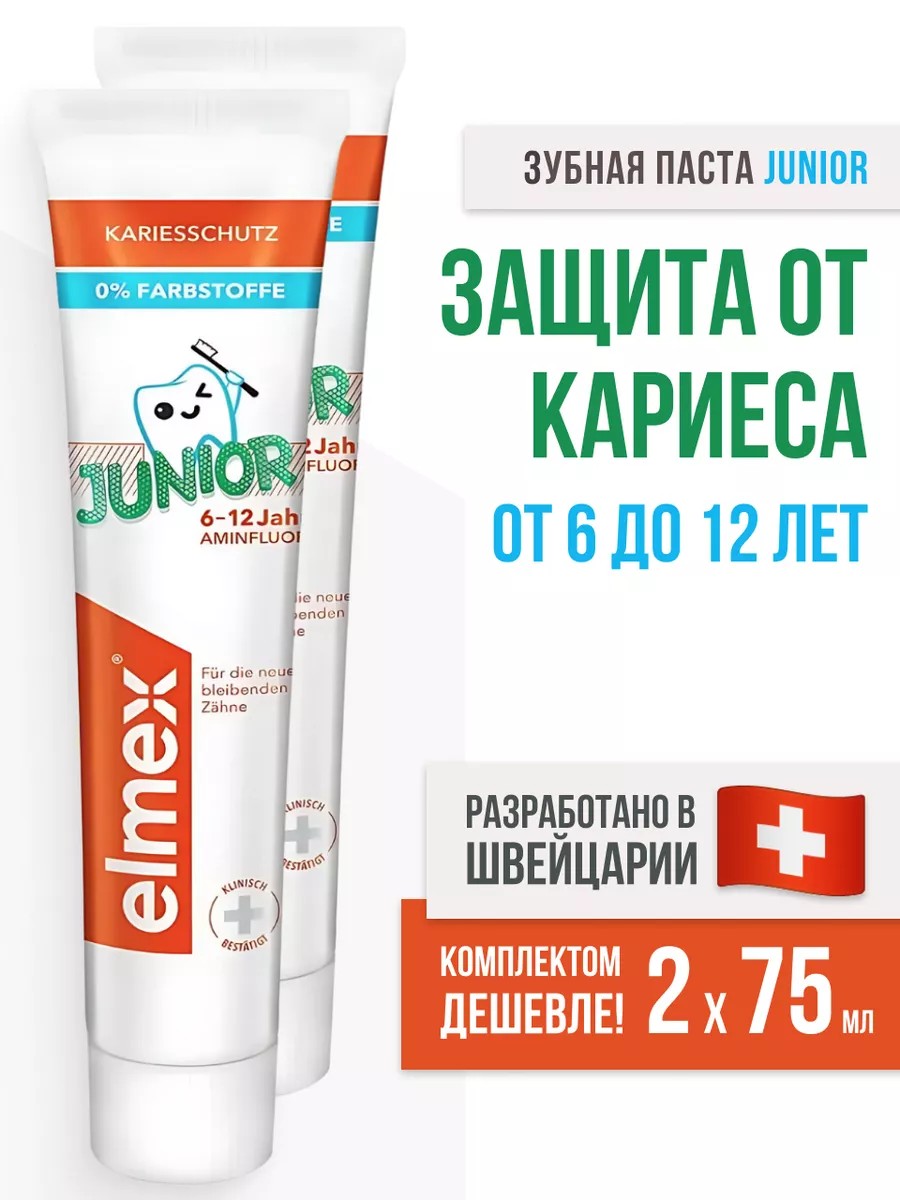 Комплект 2 шт. Детская зубная паста Elmex Junior от 6 лет до 12 лет c новой Технологией Neo-AminexTM помогает укреплять эмаль и обеспечивает защиту от кариеса вновь прорезавшихся постоянных зубов вашего ребенка.