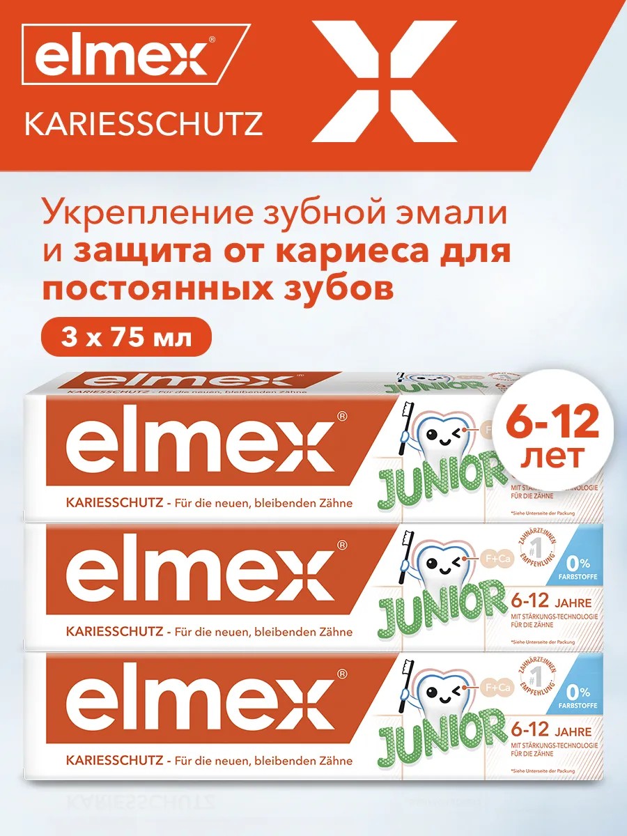 Зубная паста Elmex Junior специально предназначена для ежедневной гигиены полости рта детей в возрасте от 6 лет до 12 лет с целью обеспечения длительной защиты от кариеса, снижения деминерализации эмали и ее укрепления.