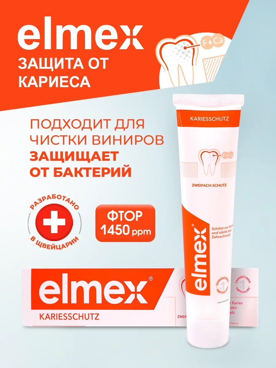 Профилактическая зубная паста Colgate Elmex «Защита от кариеса» предназначена для ежедневного ухода за полостью рта, защиты от кариеса и укрепления эмали.Эффективность состава зубной пасты доказана научными исследованиями, подтверждена клинически. Фторид натрия - активный ингредиент в составе пасты 1450 ppm образует устойчивый слой фторида кальция на поверхностях зубов, который: