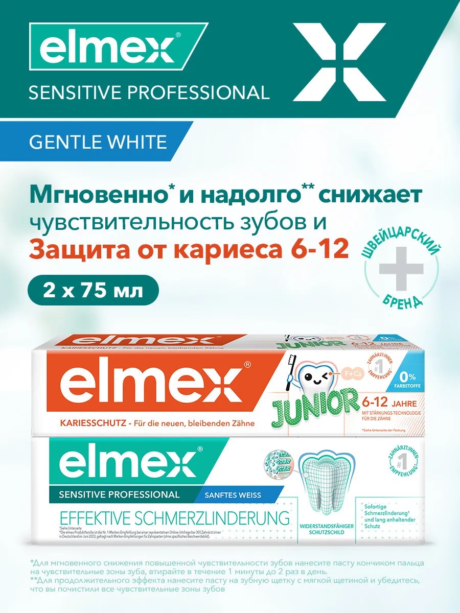 В наборе детская и взрослая зубные пасты Elmex. Детский набор для зубов Elmex Junior от 6 лет до 12 лет c новой Технологией Neo-AminexTM помогает укреплять эмаль и обеспечивает защиту от кариеса прорезавшихся постоянных зубов вашего ребенка. Подходит для мальчиков и девочек возрастом 6 лет, 7 лет, 8 лет, 9 лет, 10 лет, 11 лет и 12 лет. Безопасна при случайном проглатывании небольшого количества.