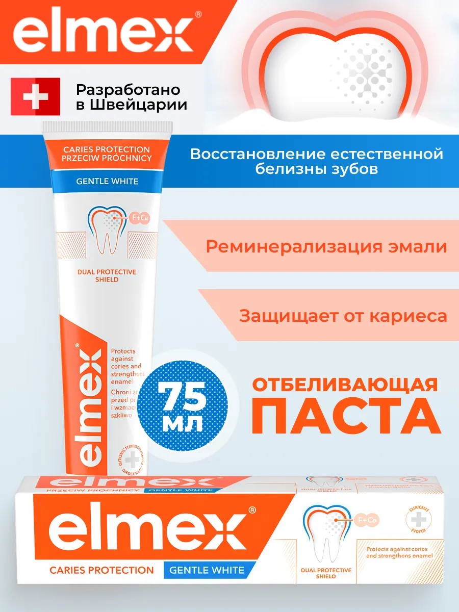 Отбеливающая паста elmex caries protection gental white изготовлена по новой технологии Neo-AminexTM для комплексного ухода: идеальный выбор для здоровья зубов и десен. Ищете эффективное средство для полости рта? Семейная быстродействующая паста Элмекс — это лучшее решение для взрослых и детей с 7 лет. Специальная очищающая формула мягко удаляет налет и обесцвечивания и помогает восстановить естественную белизну.
