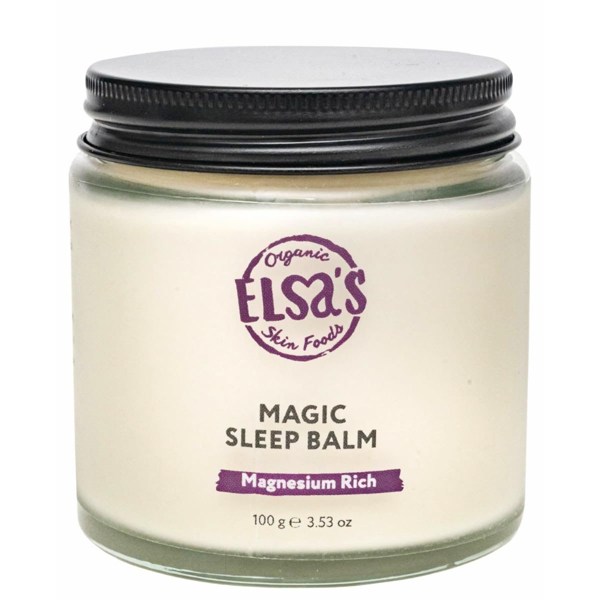 This comforting balm has been carefully formulated to work in harmony with your body's natural circadian rhythm. Rich in magnesium chloride and infused with soothing lavender, valerian root, and rose absolute, it calms both mind and body. Our vegan, cruelty-free formula is carefully packaged in a recyclable glass jar with an aluminum lid. Suitable for all genders, pregnant women, and babies, this balm is a testament to the power of natural ingredients to provide effective, refreshing, and ethical body care. Benefits of using the Magic Sleep Balm: End your sleep struggles. Fall asleep faster and sleep through the night. Reduces stress and anxiety. Calm your mind and soothe your body. Magnesium chloride is known for its calming properties and helps reduce tiredness and fatigue. Directions: Warm a pea-sized amount between your fingers to melt the formula before gently massaging it onto your skin. Use sparingly (super concentrated formula, a small amount is enough). Nighttime ritual: massage a pea-sized amount onto the tops of your feet, behind your knees, and your lower back before a restful sleep. Daytime ritual: to calm yourself during the day, breathe deeply and massage a little onto your chest and pulse points (wrists and temples).Gentle on all skin types: Safe and effective for everyone, including pregnant women and babies, this vegan, cruelty-free balm ensures natural and ethical care. Infused with soothing aromas: Includes lavender, valerian root, rose absolute, and vanilla to soothe the senses and promote relaxation. Support relaxation anytime: Perfect as a day and night ritual to calm the mind, reduce stress, and bring peace during busy times. Relieves tension and promotes relaxation: Soothes restless legs and muscle tension with the calming properties of magnesium chloride and lavender. Transform your sleep routine: Promotes deep, restorative sleep by calming the mind and body with the rich benefits of magnesium and soothing botanicals.Elsa's Organic Skin Foods, Baume de sommeil magique, baume d'aromathérapie naturel, 100 g, favorise la relaxation, lavande et magnésium, doux pour tous les types de peau, soulage le stress, aide auDESCRIPTION DU PRODUIT Ce baume cocooning, beurre a été soigneusement formulé pour fonctionner harmonieusement avec le rythme circadien naturel de votre corps. Riche en chlorure de magnésium et infusé avec de la lavande apaisante, de la racine de valériane et de l'absolu de rose, pour apaiser l'esprit et le corps. Notre formule végétalienne sans cruauté envers les animaux est soigneusement emballée dans un bocal en verre recyclable avec un couvercle en aluminium. Convient à tous les sexes, aux femmes enceintes et aux bébés, ce baume témoigne de la puissance des ingrédients naturels pour fournir des soins corporels efficaces, rafraîchissants et éthiques. Avantages de l'utilisation du baume de sommeil magique : mettez fin à vos luttes de sommeil. Dormez plus rapidement et dormez toute la nuit. - Réduit le stress et l'anxiété. Calmez votre esprit et calmez votre corps. Le chlorure de magnésium est connu pour ses propriétés calmantes et contribue à réduire la fatigue et la fatigue. Mode d'emploi : réchauffez une quantité de pois entre vos doigts pour que la formule fonde avant de masser doucement sur la peau. Utilisez avec parcimonie (formule super concentrée, une petite quantité suffit). Rituel nocturne : massez un petit pois sur le dessus des pieds, derrière les genoux, le bas du dos avant un sommeil réparateur. Rituel de jour : pour calmer pendant la journée, respirez profondément et massez un peu sur votre poitrine et vos points de pouls (poignets et tempes).Doux pour tous les types de peau : sûr et efficace pour tous, y compris les femmes enceintes et les bébés, ce baume végétalien sans cruauté envers les animaux garantit un soin naturel et éthique. Infusé avec des arômes apaisants : comprend de la lavande, de la racine de valériane, de l'absolu de rose et de la vanille pour apaiser les sens et favoriser la relaxation. Soutenez la détente à tout moment : parfait comme rituel de jour et de nuit pour calmer l'esprit, réduire le stress et apporter la paix pendant les moments trépidants. Soulage la tension et la détente : soulage les jambes agitées et les tensions musculaires avec les propriétés apaisantes du chlorure de magnésium et de la lavande. Transformez votre routine de sommeil : favorise un sommeil profond et réparateur en calmant l'esprit et le corps avec des bienfaits riches en magnésium et des plantes apaisantes.