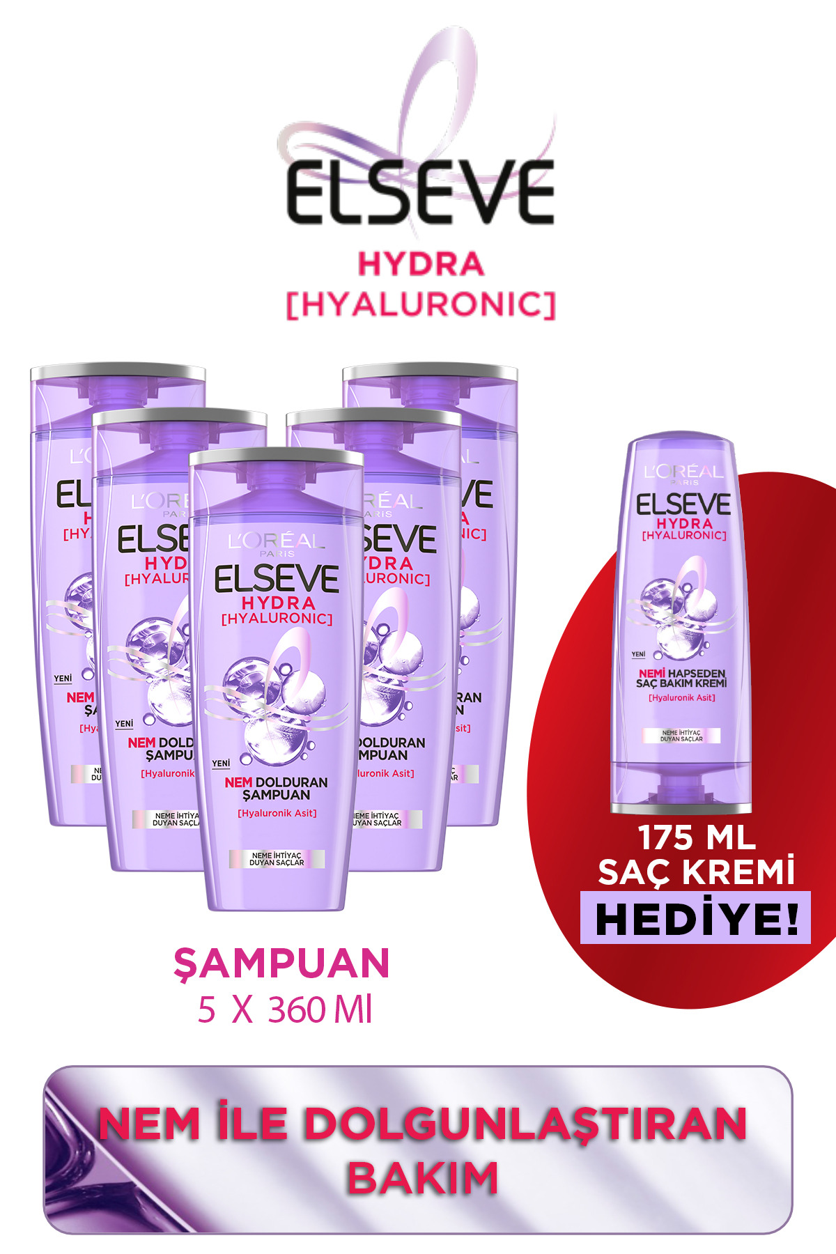• Elseve Hydra [Hyaluronic] Nem Dolduran Sampuan, Hyaluronik Asit içeren formülü ile saçi agirlastirmadan nem ile doldurarak canli görünüm kazandirir.Agirliginin 1000 kati fazla su tutabilen hyaluronik asit molekülüyle güçlendirilmis formülü ile Elseve Hydra [Hyaluronic] Nem Dolduran Sampuan saçi aninda nem ile doldurur. Daha parlak ve 80 daha nemli saçlar saglayarak, saçlarin canli görünmesini saglar, hem de saçlarinizi agirlastirmadan. Hydra Hyaluronic sampuan ve saç kreminin birlikte kullanimi sonucu, instrumental test.Islak saça masaj yaparak uygulayin, daha sonra durulayin.