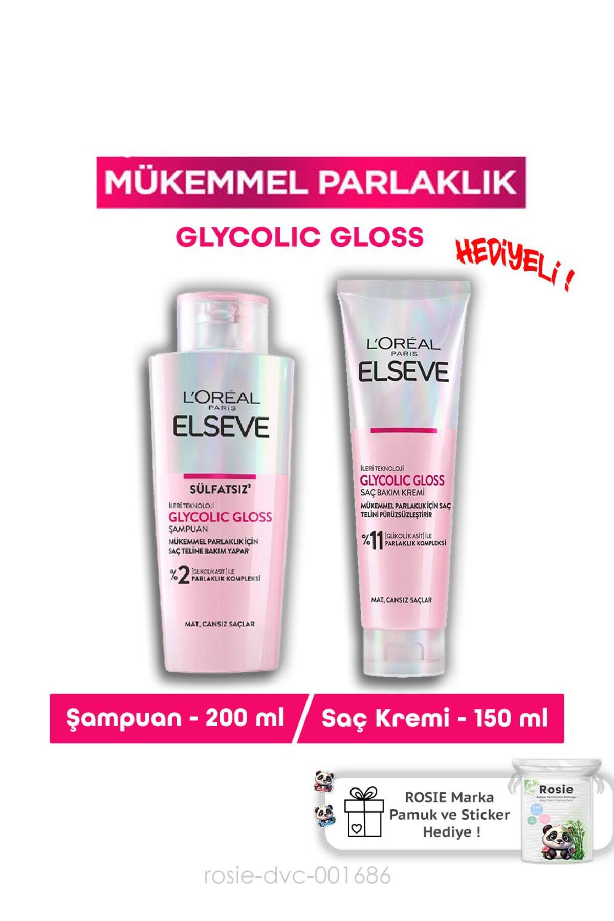 Elseve Glycolic Gloss Mükemmel Parlaklik Sampuan 200ml Glycolic Gloss Pürüzsüzlestirici Saç Kremi 150ml ve ROSIE