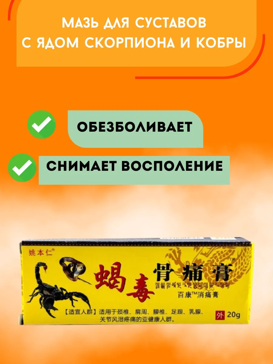 Обезболивающая мазь для суставов с ядом скорпиона и кобры — эффективное средство для снятия боли, воспаления и скованности в суставах и мышцах. Натуральный состав глубоко проникает в ткани, улучшает кровообращение и способствует восстановлению при артрите, остеохондрозе, радикулите и ревматизме. Мазь помогает при боли в спине, пояснице, коленях, шее, локтях, а также при спортивных травмах, ушибах и растяжениях. Лёгкая текстура быстро впитывается и не оставляет жирных следов. Подходит для ежедневного использования в домашних условиях. Универсальное средство при болях в теле и суставах