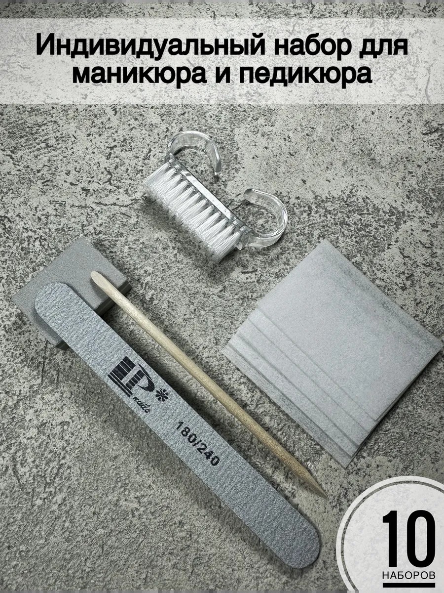 Готовые индивидуальные одноразовые наборы для маникюра и педикюра. Индивидуальный набор для ногтей дает вам преимущество перед клиентом, как мастер, который заботится о здоровье клиента и безопасности процедуры. В состав 1 индивидуального набора входит: - одноразовая двухсторонняя мини-пилка для натуральных ногтей 180/240 грит, для придания формы ногтей - 1 шт. 13 см.; - мини баф 100/180 грит, для полировки, а также удаления царапин и неровностей на поверхности 1 шт.; - безворсовые салфетки, для удаления липкого слоя и обезжиривания - 5 шт.; - апельсиновая палочка, для отодвигания кутикулы - 1 шт.; - щеточка, предназначена для бережного очищения поверхности от пыли - 1 шт. Набор подходит как для одноразового использования в салоне красоты, так и для многократного личного использования. В одном комплекте 10 индивидуальных наборов.