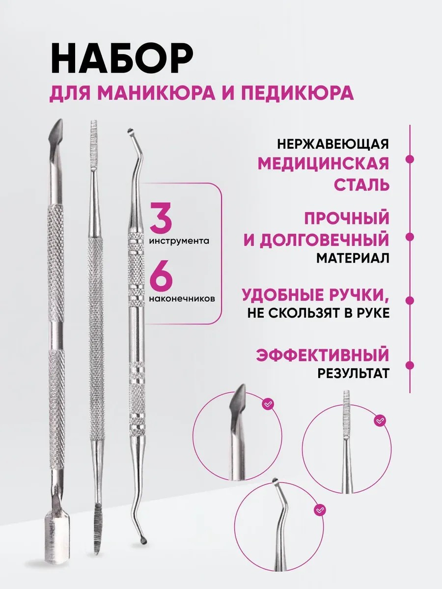 Хотите создать идеальный маникюр и педикюр прямо у себя дома? Использование хороших инструментов для правильной обрезки ногтей на руках и ногах позволяет избежать болезненных проблем, таких как заусенцы, неровные края ногтевой пластины и кожа стопы. Наш профессиональный набор инструментов для педикюра и маникюра предоставит вам все необходимые инструметы: кюретка для педикюра и маникюра, пушер для педикюра и маникюра и куретка-пилка. Пушер для кутикулы профессиональный двухсторонний, используется для отодвигания кутикулы и очистки подногтевого пространства. Одна сторона представлена в виде лопатки - для отодвигания кутикулы с ногтевой поверхности, другая называется топориком для удаления кутикулы и заусенцев, так же для устранения грязи из-под ногтей и удаления птеригия. Большая кюретка с лопаткой для педикюра и маникюра используется для коррекции вросших ногтей, а также удобно отодвинуть и подпилить часть ногтя и придать ему нужную форму. Малая кюретка с лопаткой очищается основание ногтевой пластины от ороговевшего слоя кожи, кюретка с рифленой рабочей поверхностью. Шабер маникюрный идеально очищает основание ногтевой пластины от ороговевшего слоя кожи, подходит для установки тампонады в подологии. Профессиональные инструменты набор для маникюра изготовлены из нержавеющей стали. Красивые ногти украшают руки и завершают повседневный образ женщины. Качество маникюра во многом зависит от качества используемых инструментов для ногтей для него, от качества маникюрного набора. Позаботьтесь о своих ногтях с нашим педикюрным набором – и ваши руки и ноги всегда будут выглядеть идеально!