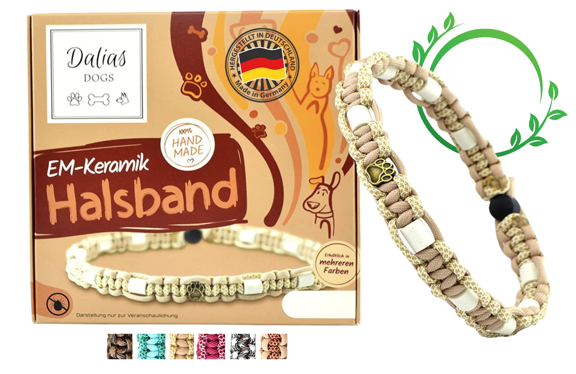 Our ligaments are made individually for your dog or cat by hand. Effective microorganisms (EM) have a positive effect on the well -being of the animal, strengthening the immune system and offer it natural protection.It is important to us that we offer the animals a poison -free alternative without chemicals.We make sure that we incorporate enough EM pipes in our EM bands, so that the effect for the size of your dog cat is granted.We have acquired this knowledge through years of experience. How do I measure the neck circumference correctly Measure exactly along the neck - where the collar would also be.The neck circumference you measure should be the smallest setting of the tape, so measure enough.The tape should be close later, but without sneezing - you can still adjust it bigger. Cleaning care Leave the collar thoroughly every 2 weeks or with heavy pollution with clear water (e.g. in the sun) so that the EM ceramic pipes can show their full effect again.The EM ceramic band should always be on the animal if possible, but the effect is not affected if it is decreased for a short time.Your darling can safely into the water with our collars! We only process original US paracord original EM-X ceramic pipes. The EM ceramic pipes from EMIKO that we use are intended for water treatment, so we must not legally advertise with the positive properties of our ligaments. A nursing instruction is included in each order. The color images can differ slightly from the original.✓Handmauf in Germany - our ligaments - each individual - are lovingly handcrafted and packed in Germany.Sustainability and environmental awareness is important to us!This is what our company stands in the dog world!. ✓Design - The brand Dalias Dogs is protected and stands for design and efficiency.It is not only important to us that our EM ceramic bands work, but also that they look good!. ✓Original - We only use the highest quality original EM ceramics pipes from a leading renowned manufacturer.In addition, we only process carefully selected original US paracord, no cheap China goods.Therefore, our EM ceramic neck bands are classified as premium EM chains.We have only selected the best materials through years of experience. ✓ adjustable sizes - With the help of our practical and carefully selected cord stopper, this collar can be adjusted in no time at all.We have the best cord stopper on the market among all EM ligaments.Guaranteed!Thanks to our various size categories, it is ideal and ""grow with"" and can ""grow"".So you will enjoy it for a long time!.Add colors and models under (Dalias Dogs) in the search bar. ✓Natural protection - the EM ceramic ligaments are completely without chemicals.Your pet is protected in a natural way.This premium band is allergen-free.Unsere Bänder werden individuell für Ihren Hund oder Ihre Katze per Hand angefertigt. Effektive Mikroorganismen (EM) haben eine positive Wirkung auf das Wohlbefinden des Tieres, Stärkung des Immunsystems und bieten ihm einen natürlichen Schutz. Uns ist es wichtig, dass wir den Tieren eine giftfreie Alternative ohne Chemikalien bieten. Wir achten darauf, dass wir in unseren EM-Bändern genügend EM-Pipes einarbeiten, sodass die Wirkung für die Größe Ihres Hundes Ihrer Katze gewährt ist. Diese Kenntnisse haben wir uns durch jahrelange Erfahrungswerte angeeignet. Wie messe ich den Halsumfang richtig Messen Sie genau am Hals entlang - dort wo sich auch das Halsband befinden würde. Der Halsumfang, den Sie messen, soll die kleinste Einstellung das Bandes sein, deswegen eng genug messen. Das Band soll später eng anliegen, jedoch ohne einzuschnüren - größer kann man es immer noch verstellen. Reinigung Pflege Das Halsband ca. alle 2 Wochen oder bei starker Verschmutzung mit klarem Wasser gründlich reinigen trocknen lassen (zb. in der Sonne), damit die EM-Keramik-Pipes wieder ihre volle Wirkung zeigen können. Das EM-Keramik-Band sollte möglichst immer am Tier sein, jedoch wird die Wirkung nicht beeinträchtigt, wenn es kurzzeitig abgenommen wird. Ihr Liebling kann bedenkenlos mit unseren Halsbändern ins Wasser! Wir verarbeiten ausschließlich original US-Paracord original EM-X Keramik-Pipes. Die EM-Keramik-Pipes von EMIKO die wir verwenden, sind zur Wasseraufbereitung gedacht, daher dürfen wir rechtlich nicht mit den positiven Eigenschaften unserer Bänder werben. Jeder Bestellung liegt ein Pflegehinweis bei. Die Farbabbildungen können vom Originalen leicht abweichen.✓HANDGEMACHT IN DEUTSCHLAND - Unsere Bänder werden - jedes einzelne - in liebevoller Handarbeit gefertigt und verpackt in Deutschland. Uns ist Nachhaltigkeit und Umweltbewusstsein wichtig! Dafür steht unser Unternehmen in der Hunde-Welt!. ✓DESIGN - Die Marke DALIAS DOGS ist geschützt und steht für Design und Effizienz. Uns ist es nicht nur wichtig, dass unsere EM-Keramik-Bänder wirken, sondern auch, dass sie gut aussehen!. ✓ORIGINAL - Wir verwenden ausschließlich hochwertigste Originale EM-Keramik Pipes eines führenden renommierten Herstellers. Außerdem verarbeiten wir nur sorgfältig ausgesuchtes Original US-Paracord, keine billige China-Ware. Daher sind unsere EM-Keramik-Halsbänder als Premium EM-Ketten eingestuft. Wir haben durch jahrelange Erfahrung ausschließlich die besten Materialien ausgesucht. ✓VERSTELLBARE GRÖßEN - Mit Hilfe unseres praktischen und sorgfältig ausgewählten Kordelstoppers lässt sich dieses Halsband im Handumdrehen in der Größe anpassen. Wir haben den besten Kordelstopper unter allen EM-Bändern auf dem Markt. Garantiert! Durch unsere verschiedenen Grössenkategorien passt es großen wie kleinen Hunden, Welpen, Katzen und Kätzchen ideal und kann "mitwachsen". So werden Sie lange Freude daran haben!. WEITER FARBEN UND MODELLE UNTER (DALIAS DOGS) IN DER SUCHLEISTE EINGEBEN. ✓NATÜRLICHER SCHUTZ - Die EM-Keramik Bänder sind komplett ohne Chemikalien. Ihr Haustier wird auf natürliche Weise geschützt. Dieses Premium-Band ist allergenfrei.