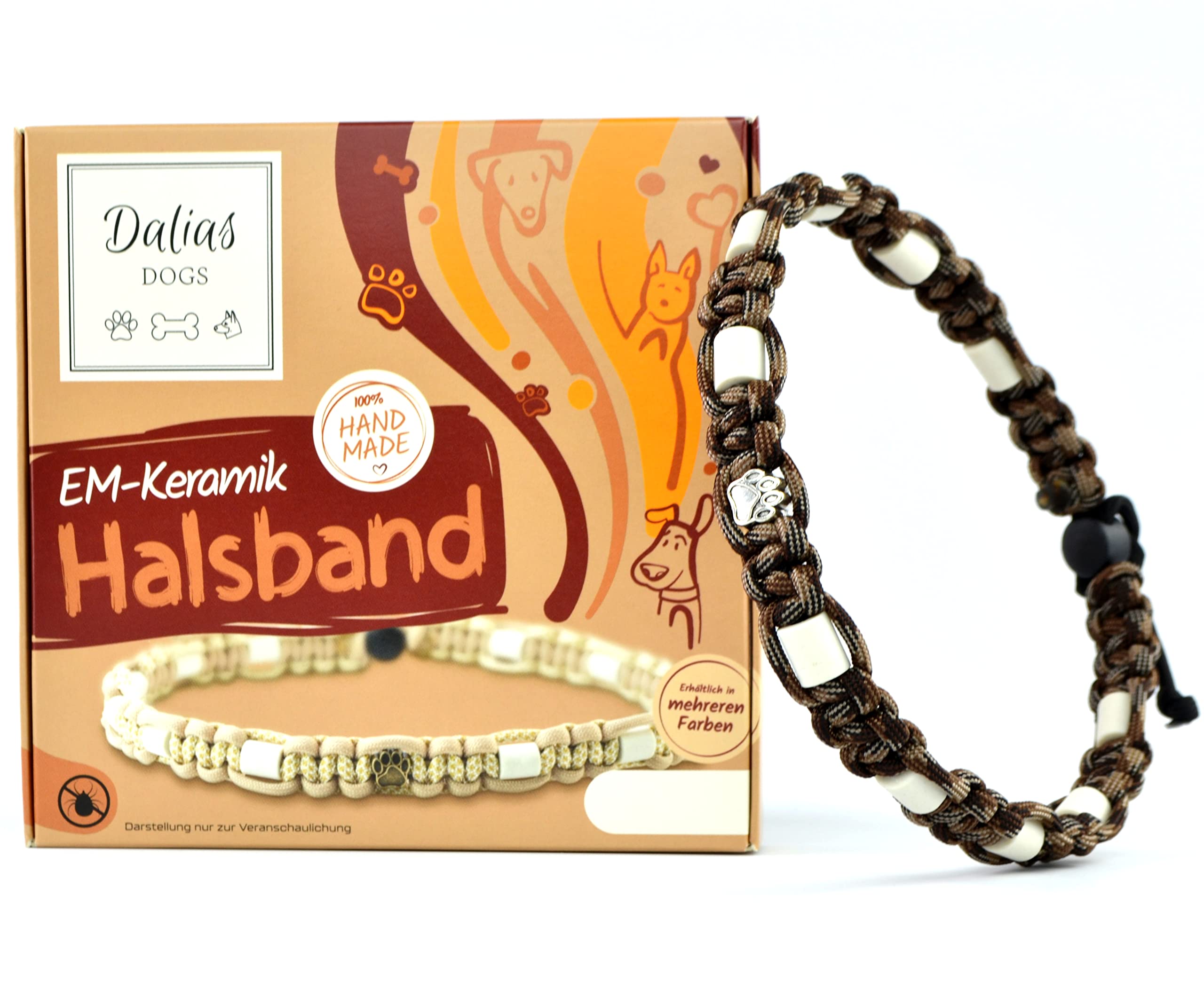 Our ligaments are made individually for your dog or cat by hand. Effective microorganisms (EM) have a positive effect on the well -being of the animal, strengthening the immune system and offer it natural protection.It is important to us that we offer the animals a poison -free alternative without chemicals.We make sure that we incorporate enough EM pipes in our EM bands, so that the effect for the size of your dog cat is granted.We have acquired this knowledge through years of experience. How do I measure the neck circumference correctly Measure exactly along the neck - where the collar would also be.The neck circumference you measure should be the smallest setting of the tape, so measure enough.The tape should be close later, but without sneezing - you can still adjust it bigger. Cleaning care Leave the collar thoroughly every 2 weeks or with heavy pollution with clear water (e.g. in the sun) so that the EM ceramic pipes can show their full effect again.The EM ceramic band should always be on the animal if possible, but the effect is not affected if it is decreased for a short time.Your darling can safely into the water with our collars! We only process original US paracord original EM-X ceramic pipes. The EM ceramic pipes from EMIKO that we use are intended for water treatment, so we must not legally advertise with the positive properties of our ligaments. A nursing instruction is included in each order. The color images can differ slightly from the original.✓Handmauf in Germany - our ligaments - each individual - are lovingly handcrafted and packed in Germany.Sustainability and environmental awareness is important to us!This is what our company stands in the dog world!. ✓Design - The brand Dalias Dogs is protected and stands for design and efficiency.It is not only important to us that our EM ceramic bands work, but also that they look good!. ✓Original - We only use the highest quality original EM ceramics pipes from a leading renowned manufacturer.In addition, we only process carefully selected original US paracord, no cheap China goods.Therefore, our EM ceramic neck bands are classified as premium EM chains.We have only selected the best materials through years of experience. ✓ adjustable sizes - With the help of our practical and carefully selected cord stopper, this collar can be adjusted in no time at all.We have the best cord stopper on the market among all EM ligaments.Guaranteed!Thanks to our various size categories, it is ideal and "grow with" and can "grow".So you will enjoy it for a long time!.Add colors and models under (Dalias Dogs) in the search bar. ✓Natural protection - the EM ceramic ligaments are completely without chemicals.Your pet is protected in a natural way.This premium band is allergen-free.Unsere Bänder werden individuell für Ihren Hund oder Ihre Katze per Hand angefertigt. Effektive Mikroorganismen (EM) haben eine positive Wirkung auf das Wohlbefinden des Tieres, Stärkung des Immunsystems und bieten ihm einen natürlichen Schutz. Uns ist es wichtig, dass wir den Tieren eine giftfreie Alternative ohne Chemikalien bieten. Wir achten darauf, dass wir in unseren EM-Bändern genügend EM-Pipes einarbeiten, sodass die Wirkung für die Größe Ihres Hundes Ihrer Katze gewährt ist. Diese Kenntnisse haben wir uns durch jahrelange Erfahrungswerte angeeignet. Wie messe ich den Halsumfang richtig Messen Sie genau am Hals entlang - dort wo sich auch das Halsband befinden würde. Der Halsumfang, den Sie messen, soll die kleinste Einstellung das Bandes sein, deswegen eng genug messen. Das Band soll später eng anliegen, jedoch ohne einzuschnüren - größer kann man es immer noch verstellen. Reinigung Pflege Das Halsband ca. alle 2 Wochen oder bei starker Verschmutzung mit klarem Wasser gründlich reinigen trocknen lassen (zb. in der Sonne), damit die EM-Keramik-Pipes wieder ihre volle Wirkung zeigen können. Das EM-Keramik-Band sollte möglichst immer am Tier sein, jedoch wird die Wirkung nicht beeinträchtigt, wenn es kurzzeitig abgenommen wird. Ihr Liebling kann bedenkenlos mit unseren Halsbändern ins Wasser! Wir verarbeiten ausschließlich original US-Paracord original EM-X Keramik-Pipes. Die EM-Keramik-Pipes von EMIKO die wir verwenden, sind zur Wasseraufbereitung gedacht, daher dürfen wir rechtlich nicht mit den positiven Eigenschaften unserer Bänder werben. Jeder Bestellung liegt ein Pflegehinweis bei. Die Farbabbildungen können vom Originalen leicht abweichen.✓HANDGEMACHT IN DEUTSCHLAND - Unsere Bänder werden - jedes einzelne - in liebevoller Handarbeit gefertigt und verpackt in Deutschland. Uns ist Nachhaltigkeit und Umweltbewusstsein wichtig! Dafür steht unser Unternehmen in der Hunde-Welt!. ✓DESIGN - Die Marke DALIAS DOGS ist geschützt und steht für Design und Effizienz. Uns ist es nicht nur wichtig, dass unsere EM-Keramik-Bänder wirken, sondern auch, dass sie gut aussehen!. ✓ORIGINAL - Wir verwenden ausschließlich hochwertigste Originale EM-Keramik Pipes eines führenden renommierten Herstellers. Außerdem verarbeiten wir nur sorgfältig ausgesuchtes Original US-Paracord, keine billige China-Ware. Daher sind unsere EM-Keramik-Halsbänder als Premium EM-Ketten eingestuft. Wir haben durch jahrelange Erfahrung ausschließlich die besten Materialien ausgesucht. ✓VERSTELLBARE GRÖßEN - Mit Hilfe unseres praktischen und sorgfältig ausgewählten Kordelstoppers lässt sich dieses Halsband im Handumdrehen in der Größe anpassen. Wir haben den besten Kordelstopper unter allen EM-Bändern auf dem Markt. Garantiert! Durch unsere verschiedenen Grössenkategorien passt es großen wie kleinen Hunden, Welpen, Katzen und Kätzchen ideal und kann "mitwachsen". So werden Sie lange Freude daran haben!. WEITER FARBEN UND MODELLE UNTER (DALIAS DOGS) IN DER SUCHLEISTE EINGEBEN. ✓NATÜRLICHER SCHUTZ - Die EM-Keramik Bänder sind komplett ohne Chemikalien. Ihr Haustier wird auf natürliche Weise geschützt. Dieses Premium-Band ist allergenfrei.