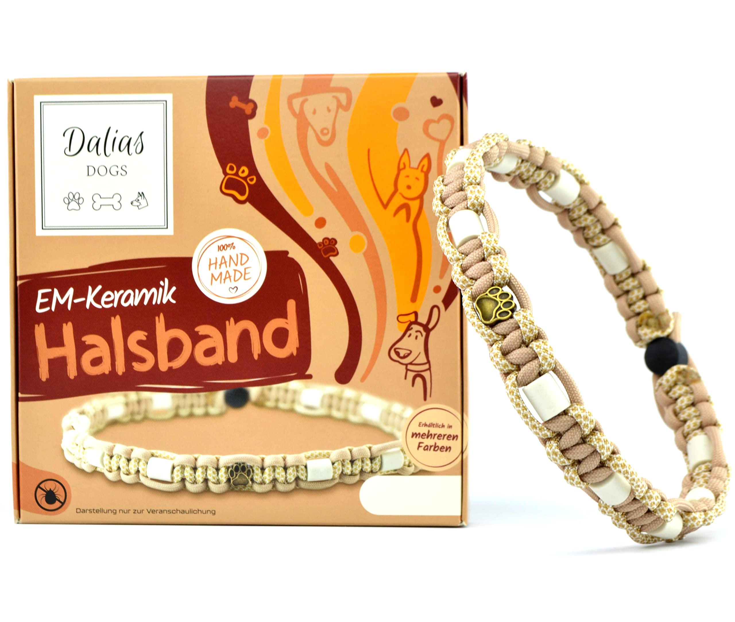 Our ligaments are made individually for your dog or cat by hand. Effective microorganisms (EM) have a positive effect on the well -being of the animal, strengthening the immune system and offer it natural protection.It is important to us that we offer the animals a poison -free alternative without chemicals.We make sure that we incorporate enough EM pipes in our EM bands, so that the effect for the size of your dog cat is granted.We have acquired this knowledge through years of experience. How do I measure the neck circumference correctly Measure exactly along the neck - where the collar would also be.The neck circumference you measure should be the smallest setting of the tape, so measure enough.The tape should be close later, but without sneezing - you can still adjust it bigger. Cleaning care Leave the collar thoroughly every 2 weeks or with heavy pollution with clear water (e.g. in the sun) so that the EM ceramic pipes can show their full effect again.The EM ceramic band should always be on the animal if possible, but the effect is not affected if it is decreased for a short time.Your darling can safely into the water with our collars! We only process original US paracord original EM-X ceramic pipes. The EM ceramic pipes from EMIKO that we use are intended for water treatment, so we must not legally advertise with the positive properties of our ligaments. A nursing instruction is included in each order. The color images can differ slightly from the original.✓Handmauf in Germany - our ligaments - each individual - are lovingly handcrafted and packed in Germany.Sustainability and environmental awareness is important to us!This is what our company stands in the dog world!. ✓Design - The brand Dalias Dogs is protected and stands for design and efficiency.It is not only important to us that our EM ceramic bands work, but also that they look good!. ✓Original - We only use the highest quality original EM ceramics pipes from a leading renowned manufacturer.In addition, we only process carefully selected original US paracord, no cheap China goods.Therefore, our EM ceramic neck bands are classified as premium EM chains.We have only selected the best materials through years of experience. ✓ adjustable sizes - With the help of our practical and carefully selected cord stopper, this collar can be adjusted in no time at all.We have the best cord stopper on the market among all EM ligaments.Guaranteed!Thanks to our various size categories, it is ideal and ""grow with"" and can ""grow"".So you will enjoy it for a long time!.Add colors and models under (Dalias Dogs) in the search bar. ✓Natural protection - the EM ceramic ligaments are completely without chemicals.Your pet is protected in a natural way.This premium band is allergen-free.Unsere Bänder werden individuell für Ihren Hund oder Ihre Katze per Hand angefertigt. Effektive Mikroorganismen (EM) haben eine positive Wirkung auf das Wohlbefinden des Tieres, Stärkung des Immunsystems und bieten ihm einen natürlichen Schutz. Uns ist es wichtig, dass wir den Tieren eine giftfreie Alternative ohne Chemikalien bieten. Wir achten darauf, dass wir in unseren EM-Bändern genügend EM-Pipes einarbeiten, sodass die Wirkung für die Größe Ihres Hundes Ihrer Katze gewährt ist. Diese Kenntnisse haben wir uns durch jahrelange Erfahrungswerte angeeignet. Wie messe ich den Halsumfang richtig Messen Sie genau am Hals entlang - dort wo sich auch das Halsband befinden würde. Der Halsumfang, den Sie messen, soll die kleinste Einstellung das Bandes sein, deswegen eng genug messen. Das Band soll später eng anliegen, jedoch ohne einzuschnüren - größer kann man es immer noch verstellen. Reinigung Pflege Das Halsband ca. alle 2 Wochen oder bei starker Verschmutzung mit klarem Wasser gründlich reinigen trocknen lassen (zb. in der Sonne), damit die EM-Keramik-Pipes wieder ihre volle Wirkung zeigen können. Das EM-Keramik-Band sollte möglichst immer am Tier sein, jedoch wird die Wirkung nicht beeinträchtigt, wenn es kurzzeitig abgenommen wird. Ihr Liebling kann bedenkenlos mit unseren Halsbändern ins Wasser! Wir verarbeiten ausschließlich original US-Paracord original EM-X Keramik-Pipes. Die EM-Keramik-Pipes von EMIKO die wir verwenden, sind zur Wasseraufbereitung gedacht, daher dürfen wir rechtlich nicht mit den positiven Eigenschaften unserer Bänder werben. Jeder Bestellung liegt ein Pflegehinweis bei. Die Farbabbildungen können vom Originalen leicht abweichen.✓HANDGEMACHT IN DEUTSCHLAND - Unsere Bänder werden - jedes einzelne - in liebevoller Handarbeit gefertigt und verpackt in Deutschland. Uns ist Nachhaltigkeit und Umweltbewusstsein wichtig! Dafür steht unser Unternehmen in der Hunde-Welt!. ✓DESIGN - Die Marke DALIAS DOGS ist geschützt und steht für Design und Effizienz. Uns ist es nicht nur wichtig, dass unsere EM-Keramik-Bänder wirken, sondern auch, dass sie gut aussehen!. ✓ORIGINAL - Wir verwenden ausschließlich hochwertigste Originale EM-Keramik Pipes eines führenden renommierten Herstellers. Außerdem verarbeiten wir nur sorgfältig ausgesuchtes Original US-Paracord, keine billige China-Ware. Daher sind unsere EM-Keramik-Halsbänder als Premium EM-Ketten eingestuft. Wir haben durch jahrelange Erfahrung ausschließlich die besten Materialien ausgesucht. ✓VERSTELLBARE GRÖßEN - Mit Hilfe unseres praktischen und sorgfältig ausgewählten Kordelstoppers lässt sich dieses Halsband im Handumdrehen in der Größe anpassen. Wir haben den besten Kordelstopper unter allen EM-Bändern auf dem Markt. Garantiert! Durch unsere verschiedenen Grössenkategorien passt es großen wie kleinen Hunden, Welpen, Katzen und Kätzchen ideal und kann "mitwachsen". So werden Sie lange Freude daran haben!. WEITER FARBEN UND MODELLE UNTER (DALIAS DOGS) IN DER SUCHLEISTE EINGEBEN. ✓NATÜRLICHER SCHUTZ - Die EM-Keramik Bänder sind komplett ohne Chemikalien. Ihr Haustier wird auf natürliche Weise geschützt. Dieses Premium-Band ist allergenfrei.