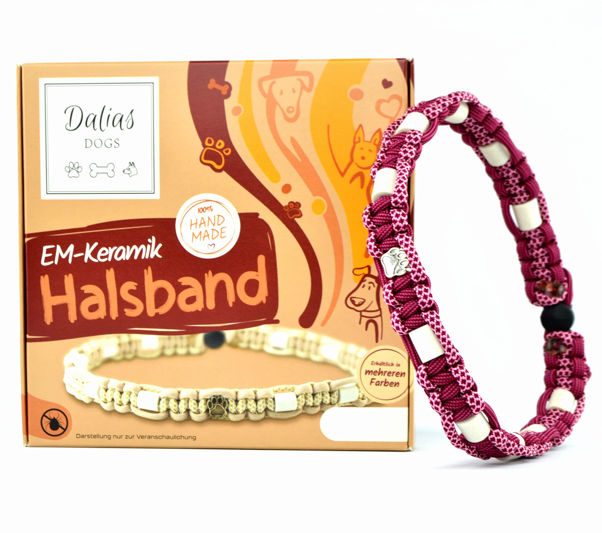 Our ligaments are made individually for your dog or cat by hand. Effective microorganisms (EM) have a positive effect on the well -being of the animal, strengthening the immune system and offer it natural protection.It is important to us that we offer the animals a poison -free alternative without chemicals.We make sure that we incorporate enough EM pipes in our EM bands, so that the effect for the size of your dog cat is granted.We have acquired this knowledge through years of experience. How do I measure the neck circumference correctly Measure exactly along the neck - where the collar would also be.The neck circumference you measure should be the smallest setting of the tape, so measure enough.The tape should be close later, but without sneezing - you can still adjust it bigger. Cleaning care Leave the collar thoroughly every 2 weeks or with heavy pollution with clear water (e.g. in the sun) so that the EM ceramic pipes can show their full effect again.The EM ceramic band should always be on the animal if possible, but the effect is not affected if it is decreased for a short time.Your darling can safely into the water with our collars! We only process original US paracord original EM-X ceramic pipes. The EM ceramic pipes from EMIKO that we use are intended for water treatment, so we must not legally advertise with the positive properties of our ligaments. A nursing instruction is included in each order. The color images can differ slightly from the original.✓Handmauf in Germany - our ligaments - each individual - are lovingly handcrafted and packed in Germany.Sustainability and environmental awareness is important to us!This is what our company stands in the dog world!. ✓Design - The brand Dalias Dogs is protected and stands for design and efficiency.It is not only important to us that our EM ceramic bands work, but also that they look good!. ✓Original - We only use the highest quality original EM ceramics pipes from a leading renowned manufacturer.In addition, we only process carefully selected original US paracord, no cheap China goods.Therefore, our EM ceramic neck bands are classified as premium EM chains.We have only selected the best materials through years of experience. ✓ adjustable sizes - With the help of our practical and carefully selected cord stopper, this collar can be adjusted in no time at all.We have the best cord stopper on the market among all EM ligaments.Guaranteed!Thanks to our various size categories, it is ideal and "grow with" and can "grow".So you will enjoy it for a long time!.Add colors and models under (Dalias Dogs) in the search bar. ✓Natural protection - the EM ceramic ligaments are completely without chemicals.Your pet is protected in a natural way.This premium band is allergen-free.Unsere Bänder werden individuell für Ihren Hund oder Ihre Katze per Hand angefertigt. Effektive Mikroorganismen (EM) haben eine positive Wirkung auf das Wohlbefinden des Tieres, Stärkung des Immunsystems und bieten ihm einen natürlichen Schutz. Uns ist es wichtig, dass wir den Tieren eine giftfreie Alternative ohne Chemikalien bieten. Wir achten darauf, dass wir in unseren EM-Bändern genügend EM-Pipes einarbeiten, sodass die Wirkung für die Größe Ihres Hundes Ihrer Katze gewährt ist. Diese Kenntnisse haben wir uns durch jahrelange Erfahrungswerte angeeignet. Wie messe ich den Halsumfang richtig Messen Sie genau am Hals entlang - dort wo sich auch das Halsband befinden würde. Der Halsumfang, den Sie messen, soll die kleinste Einstellung das Bandes sein, deswegen eng genug messen. Das Band soll später eng anliegen, jedoch ohne einzuschnüren - größer kann man es immer noch verstellen. Reinigung Pflege Das Halsband ca. alle 2 Wochen oder bei starker Verschmutzung mit klarem Wasser gründlich reinigen trocknen lassen (zb. in der Sonne), damit die EM-Keramik-Pipes wieder ihre volle Wirkung zeigen können. Das EM-Keramik-Band sollte möglichst immer am Tier sein, jedoch wird die Wirkung nicht beeinträchtigt, wenn es kurzzeitig abgenommen wird. Ihr Liebling kann bedenkenlos mit unseren Halsbändern ins Wasser! Wir verarbeiten ausschließlich original US-Paracord original EM-X Keramik-Pipes. Die EM-Keramik-Pipes von EMIKO die wir verwenden, sind zur Wasseraufbereitung gedacht, daher dürfen wir rechtlich nicht mit den positiven Eigenschaften unserer Bänder werben. Jeder Bestellung liegt ein Pflegehinweis bei. Die Farbabbildungen können vom Originalen leicht abweichen.✓HANDGEMACHT IN DEUTSCHLAND - Unsere Bänder werden - jedes einzelne - in liebevoller Handarbeit gefertigt und verpackt in Deutschland. Uns ist Nachhaltigkeit und Umweltbewusstsein wichtig! Dafür steht unser Unternehmen in der Hunde-Welt!. ✓DESIGN - Die Marke DALIAS DOGS ist geschützt und steht für Design und Effizienz. Uns ist es nicht nur wichtig, dass unsere EM-Keramik-Bänder wirken, sondern auch, dass sie gut aussehen!. ✓ORIGINAL - Wir verwenden ausschließlich hochwertigste Originale EM-Keramik Pipes eines führenden renommierten Herstellers. Außerdem verarbeiten wir nur sorgfältig ausgesuchtes Original US-Paracord, keine billige China-Ware. Daher sind unsere EM-Keramik-Halsbänder als Premium EM-Ketten eingestuft. Wir haben durch jahrelange Erfahrung ausschließlich die besten Materialien ausgesucht. ✓VERSTELLBARE GRÖßEN - Mit Hilfe unseres praktischen und sorgfältig ausgewählten Kordelstoppers lässt sich dieses Halsband im Handumdrehen in der Größe anpassen. Wir haben den besten Kordelstopper unter allen EM-Bändern auf dem Markt. Garantiert! Durch unsere verschiedenen Grössenkategorien passt es großen wie kleinen Hunden, Welpen, Katzen und Kätzchen ideal und kann "mitwachsen". So werden Sie lange Freude daran haben!. WEITER FARBEN UND MODELLE UNTER (DALIAS DOGS) IN DER SUCHLEISTE EINGEBEN. ✓NATÜRLICHER SCHUTZ - Die EM-Keramik Bänder sind komplett ohne Chemikalien. Ihr Haustier wird auf natürliche Weise geschützt. Dieses Premium-Band ist allergenfrei.