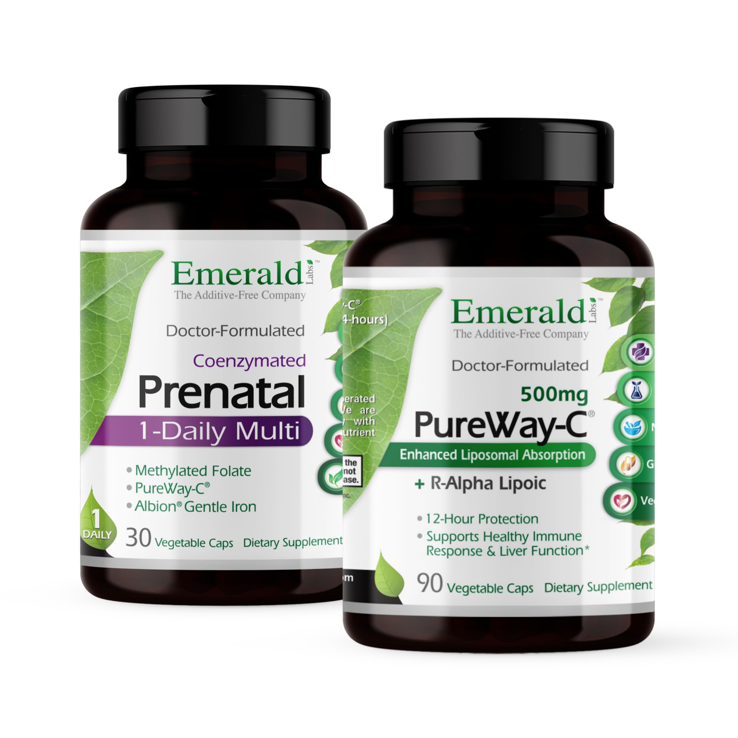 Take care of yourself and your health with this bundle that includes Emerald Labs Prenatal 1-Daily Multi and PureWay-C, designed to complement your body's natural processes. This prenatal multivitamin is tailored to support the intricate processes of pregnancy. It contains key nutrients such as methylated folate, which is vital for the healthy early fetal development of your baby's brain and bones. With the inclusion of Albion Chelated Gentle iron, you can trust that your increased iron needs are being met without causing any additional stomach discomfort. This carefully selected formula also includes our whole-food blend making it more helpful and easy to digest. We understand the importance of maintaining energy levels and overall well-being during pregnancy. That's why we've formulated this prenatal multivitamin to support your body's systems. PureWay-C is a meticulously crafted immune support supplement that not only supports your body's immune response but also provides nutritional support to your liver health. With its superior form of vitamin C, this supplement is designed to complement your body's natural processes. The inclusion of R-alpha lipoic acid as part of its composition provides antioxidant support that is mindful of your liver care needs, aiming to work in harmony with your system. Emerald Labs is committed to delivering high-quality supplements. This dedication to quality is evident in formulas manufactured without unnecessary additives, ensuring that you receive nothing but the active, bioavailable nutrients that support your body's well-being. Emerald Labs has been family-owned and operated since our beginnings in 2001. We are committed to providing your family with formulas using supportive nutrient forms, manufactured at our facility without the use of additives. Plus, all of our products are Doctor formulated. You can feel confident in supporting your health with Emerald Labs' nutritional supplements.