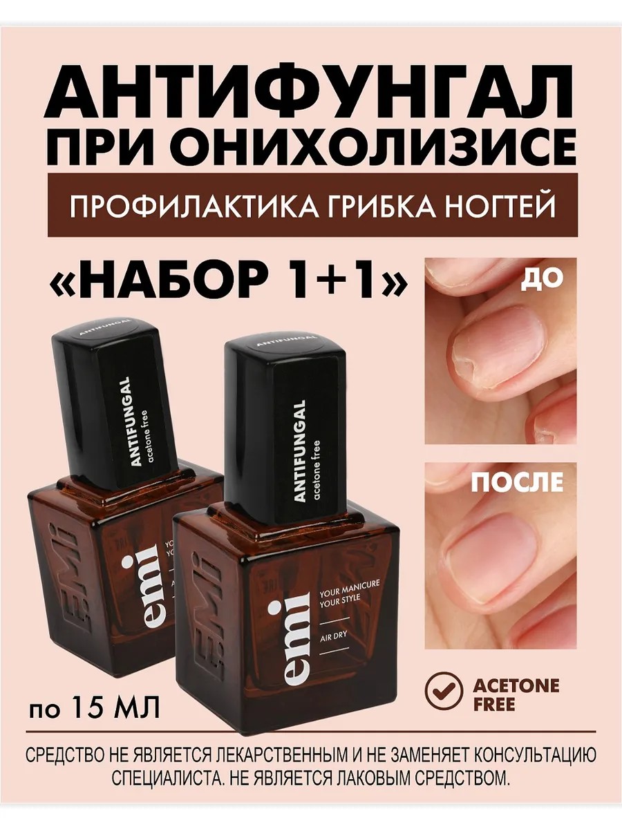 Набор "Антифунгал 1+1" от грибка ногтевой пластины 15 мл бренда E.Mi - уходовое средство для профилактики грибковых заболеваний и онихолизиса. Профессиональная прозрачная быстросохнущая формула создает на ногтях стойкое защитное покрытие. Благодаря специальным компонентам Антифунгал рекомендован для профилактики грибковых заболеваний при онихолизисе. Действующее вещество: Толнафтат - эффективный антисептик для профилактики и лечения грибковых инфекций. Этилацетат - способствует быстрому впитыванию, формирует на ногтевой пластине защитную пленку. Средство содержит активные компоненты: кератин, кальций, кремний, а также Витамины E, С и В5. Кератин в составе средства восстанавливает кератиновый слой, способствуя укреплению и усилению тонких и ломких ноготков. Оказывает восстанавливающее и регенерирующее действие на поврежденные и слоящиеся ногти ног и рук, предотвращая ломкость и появление грибка. Антифунгал поможет восстановить ногти после наращивания и применения гель – лака. Это стимулятор роста прозрачного цвета с лечебным эффектом, который защитит ногтевую пластину, улучшив ее барьерные функции, а поэтому подойдет для ухода за ногтями взрослых женщин и мужчин, девушек и парней. Лак легко наносится, быстро сохнет и удобен для домашнего использования. Состав средства для маникюрных и педикюрных процедур питает, увлажняет ногтевую пластину, стимулирует рост здоровых и крепких ногтей, помогая бороться с проблемой их обламывания. Лак от emi рекомендуется наносить кисточкой тонким слоем на предварительно очищенную ногтевую пластину и подождать до полного высыхания. При онихолизисе в домашних условиях жидкость капать в подногтевые карманы 2 раза в день до полного срастания. Это отличный выбор для косметической и профилактической обработки ноготков на руках и ногах. Антифунгал эми станет приятным и полезным подарочным комплиментом для родных, близких и друзей. У нас есть акции и распродажи, вы можете купить наши товары в подарок со скидкой. *не является лекарственным средством.