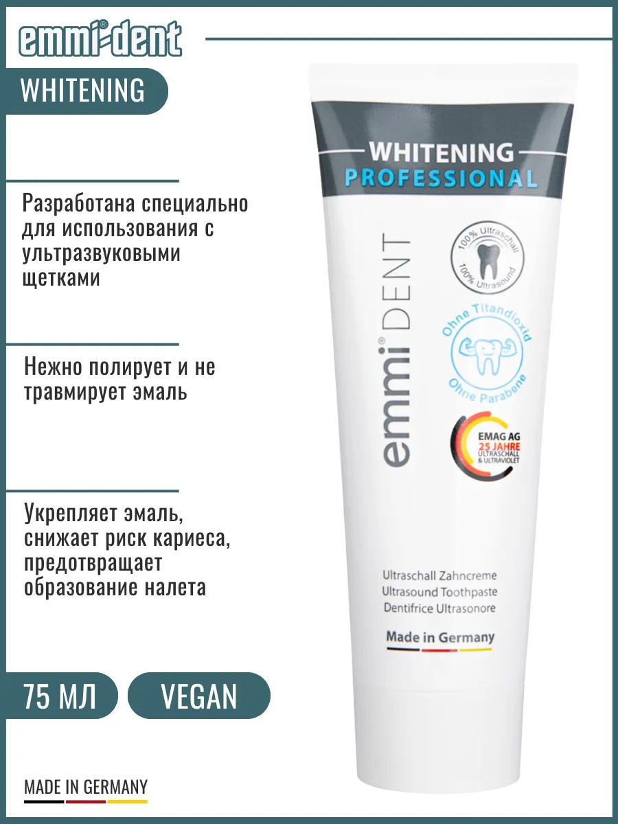Зубная паста Emmi-Dent Whitening разработана специально для использования вместе с ультразвуковыми зубными щетками. В сочетании, во время чистки паста каждую долю секунды образует миллионы микропузырьков, которые лопаются под воздействием ультразвуковых колебаний воздуха, удаляя зубной налет, следы пищи, микробы и бактерии. Эти микропузырьки могут проникать в самые маленькие трещины эмали и труднодоступные участки зубного ряда.