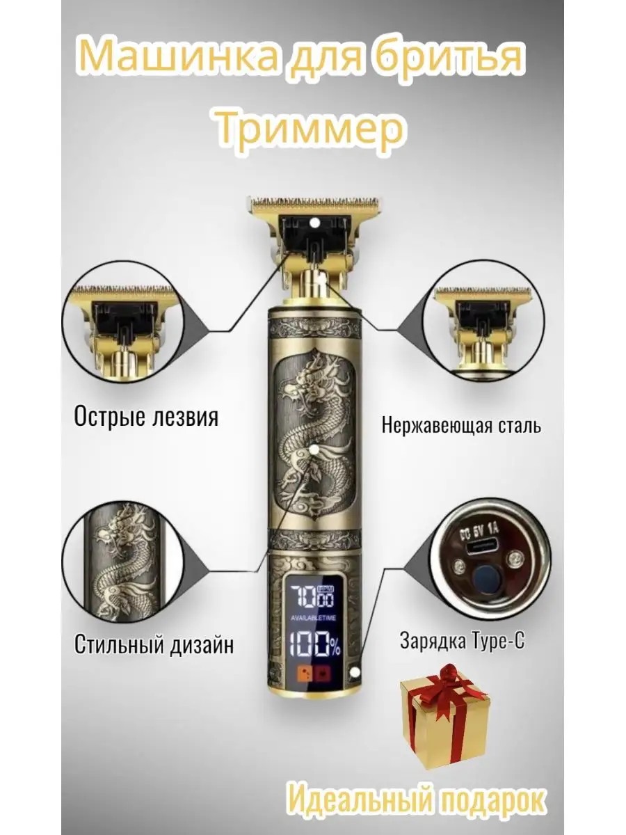 Портативный триммер как в барбешопе - беспроводной универсальный девайс для стрижки волос, бороды и усов. Качественная электрическая машинка позволит хорошо экономить на парикмахерской и стилисте, на покупке различных кремов для бритья и сменных головок для бритвенного станка, на бритве металлической и кассет для бритья. Шейвер предназначен для ежедневного чистого сухого бритья щетины, использования дома и в дорожных условиях. Подровнять контуры бороды поможет безопасная бритва. Машинка для бритья мужская не вызывает раздражения кожи, легко обслуживается. В комплекте идет электротриммер, смазочное масло и маленькая щеточка для ухода за инструментом, 4 сменные насадки 1.5, 2, 3, 4 мм. Приятный дизайн и эргономичная ручка электробритвы позволяют удобно держать ее в руке. Кнопка включения/выключения находится снизу - с торца ручки, что позволяет не задеть её во время бритья или стрижки. Цвет черный или золотистый (с рисунком дракон). Главные особенности прибора: железный водонепроницаемый корпус, позволяющий промывать систему после коррекции и стрижки, острые лезвия из нержавеющей стали и легкий алюминиевый корпус вместо пластика. Подстригательная машинка с лет дисплеем стрижет не хуже, чем профессиональный или premium (премиум) качества аппарат. Набор по уходу за бородой удаляет лишнюю длину. В комплекте также имеется зарядное устройство и аккумуляторная батарейка. Триммер отлично сбривает волоски различной жесткости. Многофункциональный триммер для бритья головы, подмышек, подходит для бровей, для мужской интимной зоны и для тела. Это универсальная машинка для чистки лица от волос. Возможно использование с машинкой для полировки волос, стайлером для укладки волос, электрическим женским депилятором для депиляции. Машина для стрижки с щеткой и зарядкой будет отличным подарком на день рождения, 23 февраля, годовщину, день святого Валентина и любой другой праздник мужу, брату, отцу, папе, дедушке, сыну, внуку, коллеге и любому человеку. Электробритва - недорогой бюджетный подарок для взрослых мужчин, для себя или близкого человека. Это отличный подарочный набор для бритья на Новый год. Ваши близкие высоко оценят оригинальный новогодний практичный сюрприз! Красота и здоровье со средствами для роста, удаления и ухода для бороды обеспечены. Бытовая техника легка и удобна в эксплуатации.