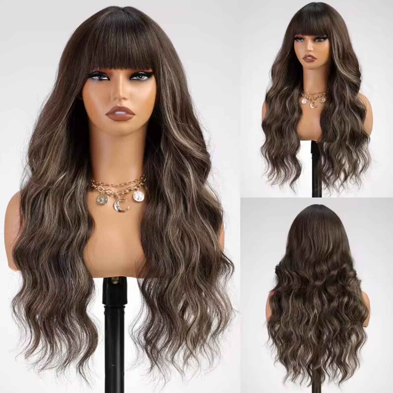 EMMOR Aschbraune Highlight-Perücken mit Pony, lockige synthetische Damenperücke, lange hitzebeständige Perücke für den täglichen Gebrauch, natürlich und bequem Aschbraune Strähnen-A