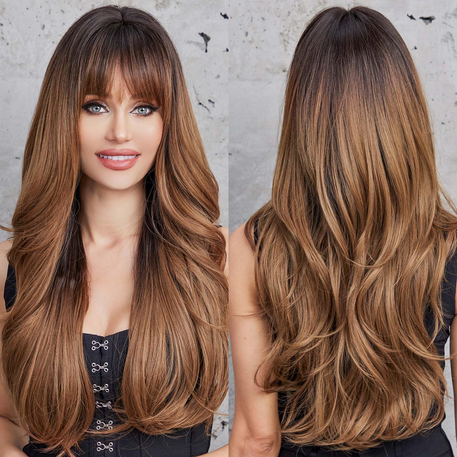Esmee 24 inch Long Curly Hair Wigs for Women Brown Natural Synthetic Heat Resistant Wigs with Bangs