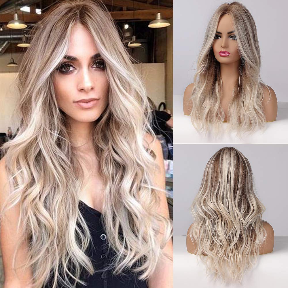 Emmor Gray Blonde Highlight Wigs for Women Long Curly Middle Part Heat Resistant Synthetic Wigs