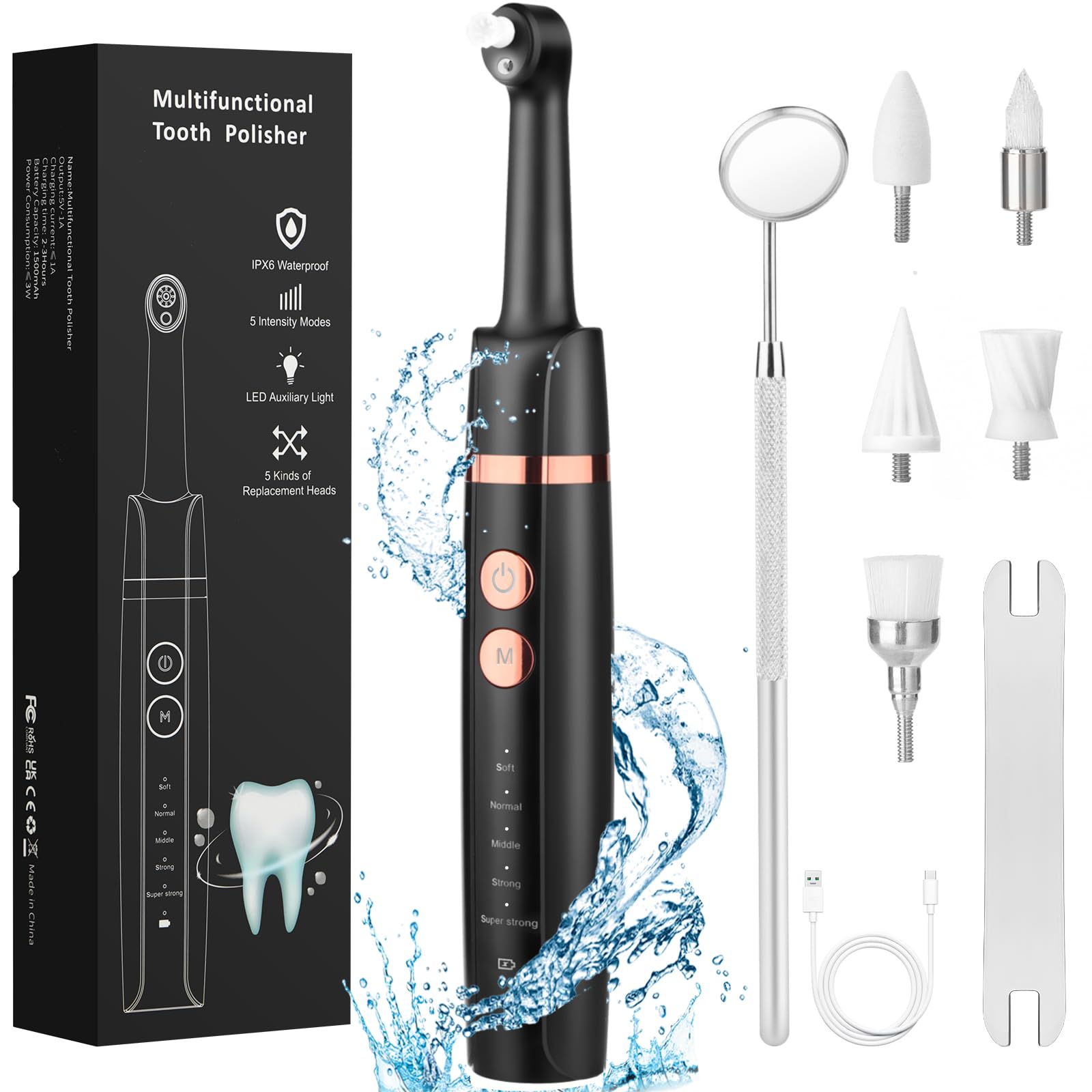 Rechargeable Battery: Equipped with a Type-C port, it can be used more than 20 times on a single charge and its compact size makes it easy to take home and travel. IPX6 waterproof: can be rinsed under running water (not immersed in water). Teeth whitening kits prevent stains and ensure beauty and hygiene. It is safe and easy to use. LED Light: Equipped with LED lights, you can observe the effect of using more clearly and intuitively during the process. It can also prevent gum damage during use. 5 Modes: This teeth whitening kit is equipped with five modes (soft, normal, medium, strong, super strong) to adapt to different gum sensitivities and meet different needs. 5 Multifunctional Replacement Heads: The teeth whitening kit consists of 5 interchangeable heads for cleaning and teeth whitening.Tanden bleken Set Tanden Verwijderaar Tanden Reinigingsset Tandsteen Vlekverwijderaar Tanden Polijsten na het reinigen van tanden om tandplakafzettingen te verminderenOplaadbare batterij: uitgerust met een Type-C poort, kan het meer dan 20 keer worden gebruikt op een enkele lading en zijn compacte grootte maakt het gemakkelijk om thuis te nemen en te reizen. IPX6 waterdicht: kan worden gespoeld onder stromend water (niet ondergedompeld in water). Teeth whitening kits voorkomen vlekken en zorgen voor schoonheid en hygiëne. Het is veilig en eenvoudig te gebruiken. LED-licht: uitgerust met LED-lichten, kunt u het effect van het gebruik duidelijker en intuïtiever observeren tijdens het proces. Het kan ook tandvleesbeschadiging tijdens gebruik voorkomen. 5 modi: deze tanden bleken kit is uitgerust met vijf modi (zacht, normaal, medium, sterk, super sterk) om zich aan te passen aan verschillende tandvleesgevoeligheden en voldoen aan verschillende behoeften. 5 Multifunctionele vervangende hoofden: De tanden bleken kit bestaat uit 5 verwisselbare hoofden voor reiniging en tanden bleken.