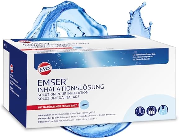 Scope of delivery: 60 ampoules of 5 ml ready for use and hygienically packaged.The salt solution serves for inhalation with an inhalation device and can also be used as a carrier solution for respiratory therapy - suitable for babies, children and adults.Emser inhalation solution is a ready -to -use isotone solution to the natural Emser salt - this unique mineral complex is responsible for the special effectiveness.The bronchi are freed in naturally - proven with increased mucus formation in acute and chronic diseases of the airways.Breathe freed with the Emser inhalation solution: Solve actively stuck mucus and support the cleaning mechanisms of the airways.