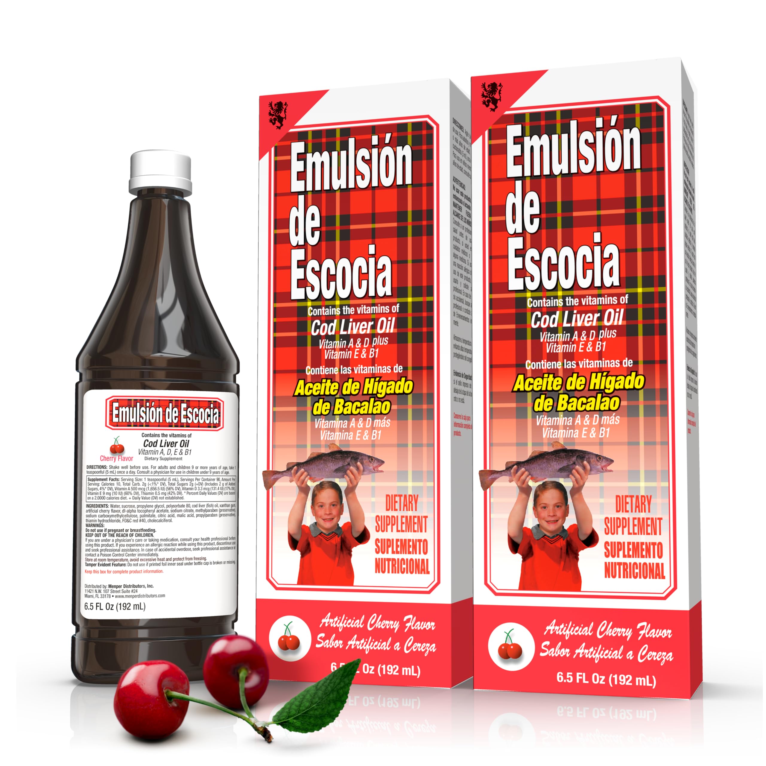 Experience the power of traditional Scottish wellness with Emulsión de Escocia, a premium cod liver oil supplement now available in a convenient 2-pack of 6.5 oz bottles. This time-tested formula combines the essential goodness of cod liver oil with a pleasant cherry flavor, making it an enjoyable daily supplement for the whole family. Each serving delivers a potent blend of vital nutrients, including the naturally occurring Vitamins A and D found in cod liver oil, enhanced with additional Vitamin E and B1. This comprehensive vitamin profile supports overall health, immune function, bone strength, and cellular vitality. The delicious cherry flavor masks the traditional fish oil taste, ensuring a pleasant experience with every dose. Emulsión de Escocia stands out as a dietary supplement that brings together centuries of Scottish fishing tradition with modern nutritional science. The high-quality cod liver oil is carefully processed to preserve its natural benefits while ensuring optimal purity and potency. This emulsion format provides better absorption and bioavailability compared to traditional oil supplements. Perfect for those seeking to maintain their health naturally, this supplement is an excellent source of essential fatty acids, including beneficial omega-3s. The easy-to-take formula is ideal for daily use, supporting various aspects of health from vision and bone strength to immune system function and cognitive performance. The convenient 2-pack ensures you'll have an ample supply of this beneficial supplement, while the 6.5 oz size is perfect for both individual and family use. Whether you're looking to support your overall wellness, boost your vitamin intake, or maintain a healthy lifestyle, Emulsión de Escocia offers a trusted, palatable solution backed by generations of use and modern nutritional understanding.[ EASY DOSAGE ] - Pleasant cherry taste masks fish flavor includes measuring cup for precise 5 ml servings safe for daily consumption stores easily in a cool place maintains potency for 24 months. [ JOINT CARE ] - Supports flexibility and mobility helps maintain cartilage health reduces joint stiffness promotes bone density assists with comfortable movement during daily activities. [ HEART WELLNESS ] - Promotes cardiovascular health supports healthy blood pressure levels maintains arterial function helps regulate cholesterol contributes to overall circulatory system performance. [ BRAIN HEALTH ] - Supports cognitive development enhances memory and focus contains natural omega-3 fatty acids promotes neural growth helps maintain mental clarity throughout daily activities. [ IMMUNE SUPPORT ] - Supports healthy immune function provides essential vitamins A and D promotes bone strength and development helps maintain vision health convenient liquid form for easy absorption.