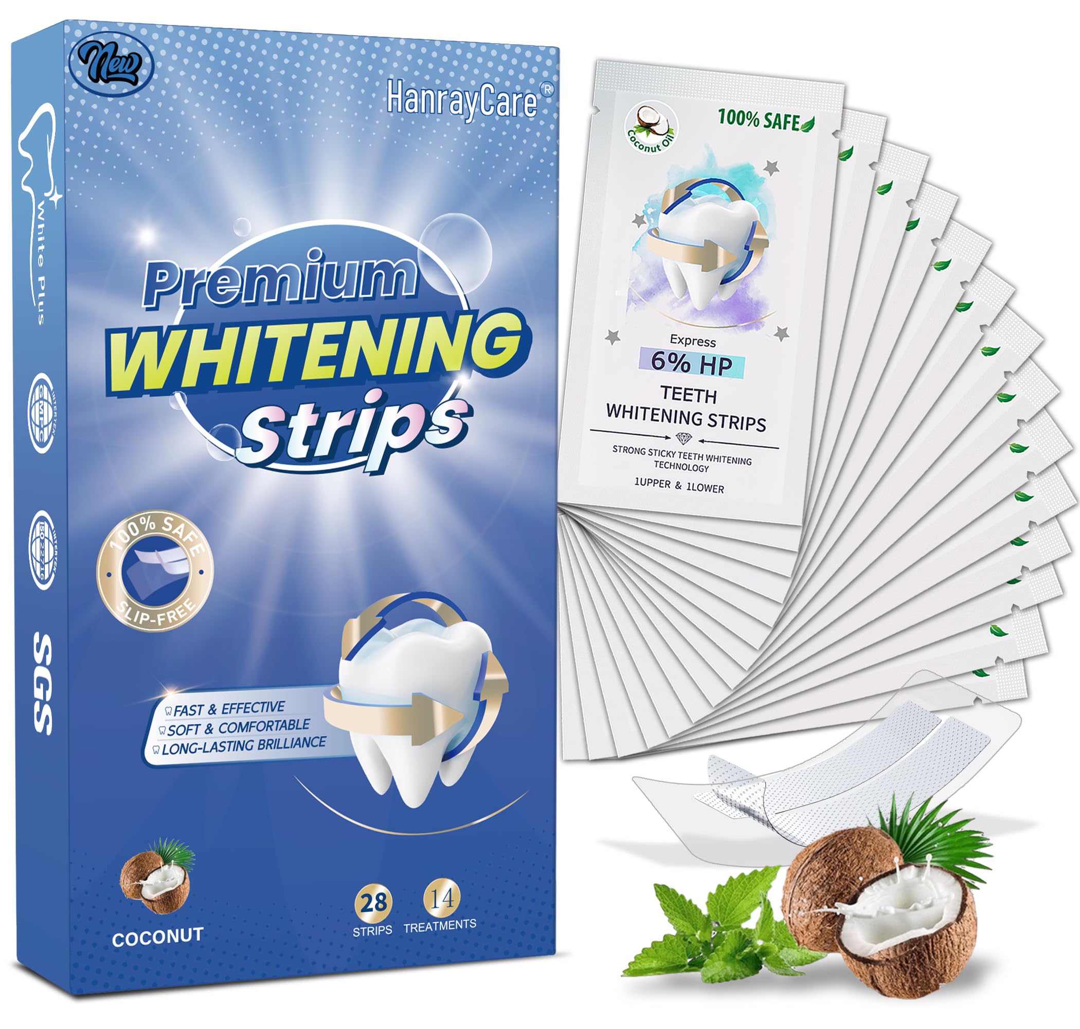 Enamel-Safe Teeth Whitening Strips for Deep Stain Removal Professional Dentist-Approved with Hydrogen Peroxide Super Sticky & Non-Slip Clinically Tested Brightening Kit 28 Ct (14-Day) | HanrayCare Coconut Advanced | 28