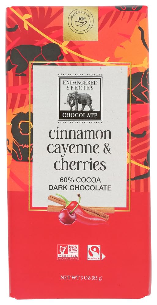 Endangered Species - Dark Chocolate Bar 60% with Cinnamon Cayenne and Cherries - 3 oz.pack of 2